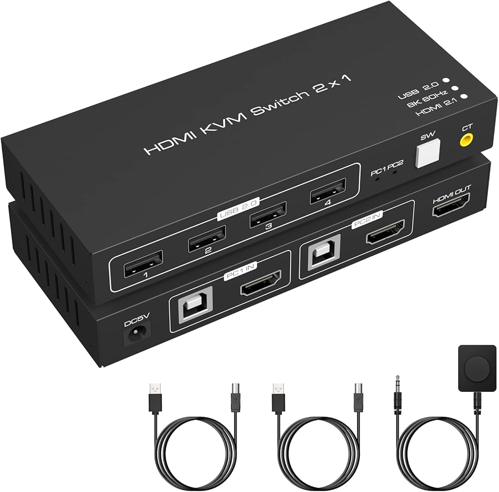 KVM Switch HDMI 2 Port 8K 60Hz 4 Port USB 2.0 for 2 Computers 1 Monitor Share Keyboard Mouse Printer Support Wire-Desktop Controller Including 2 USB 2.0 Cable