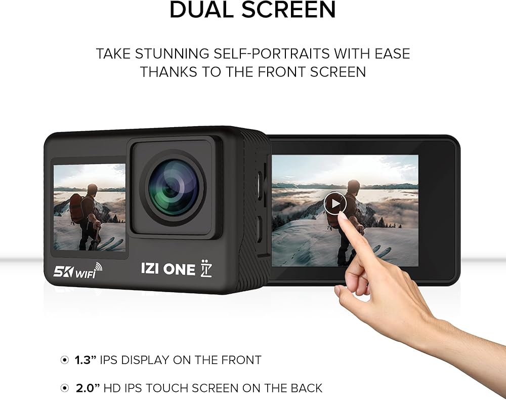 DUAL TOUCH SCREEN, ADVANCE EIS STABILIZATION : Experience convenience and versatility with this action camera, equipped with dual touch screens measuring 2.0 inches and 1.3 inches. Enjoy effortless control and easy navigation. It also features EIS stabilization, ensuring smooth and steady footage, even in challenging conditions