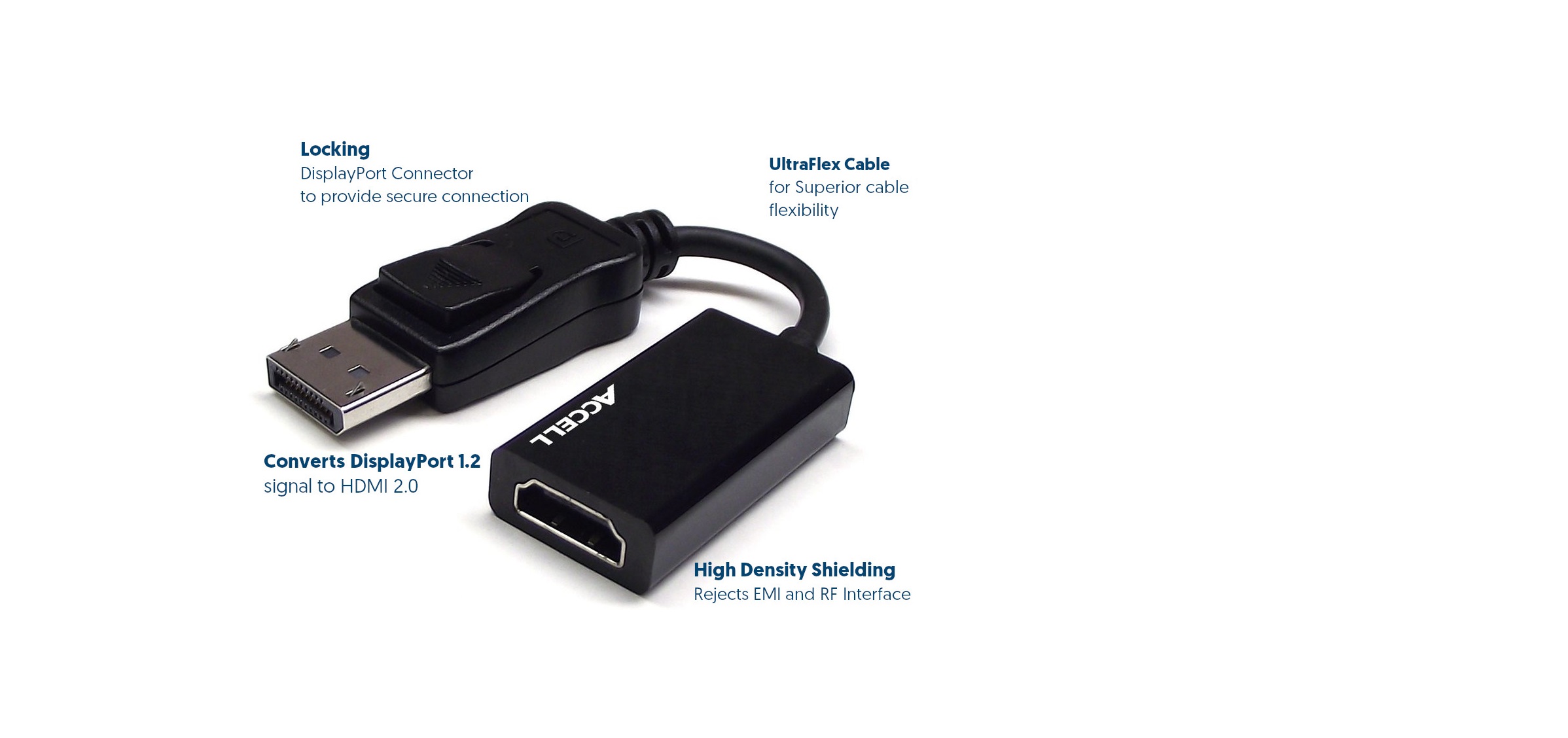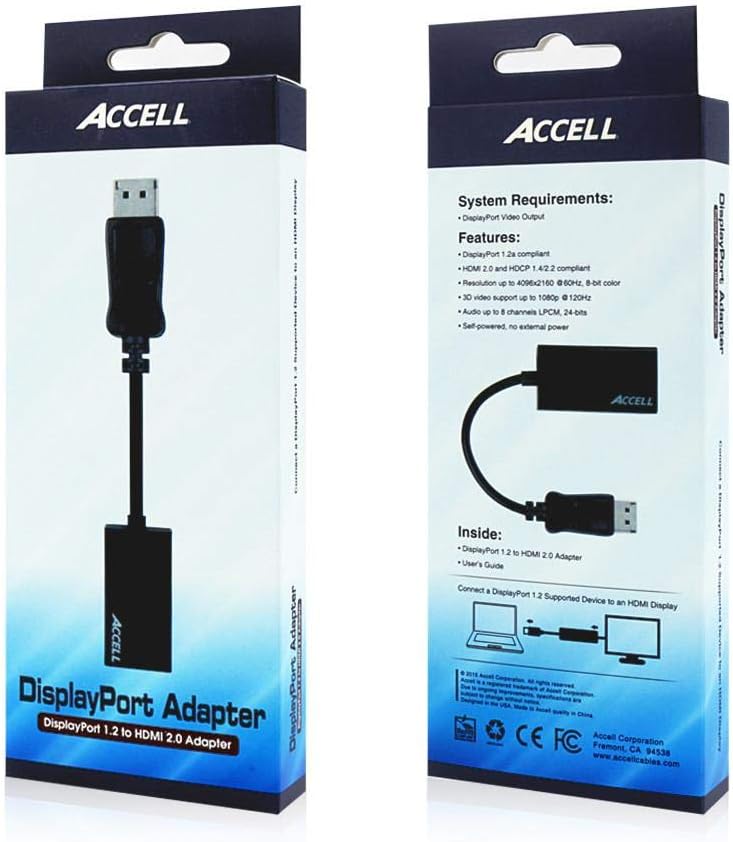 The Accell HDMI Adapter - Active Displayport 1.2 to HDMI 2.0 (B086B-011B) enables your DisplayPort supported computer to connect to any HDMI high-definition display. With HDMI 2.0 throughput up to 18Gbps, this DisplayPort to HDMI adapter is ideal for 4K video at a smooth 60Hz frame rate. Accell's active adapter technology ensures compatibility with all DisplayPort equipped devices. Also compatible with AMD Eyefinity, NVIDIA Surround, and Intel Mosaic and Collage systems.