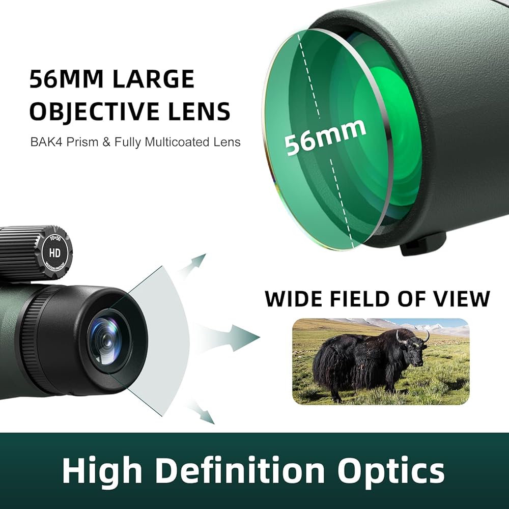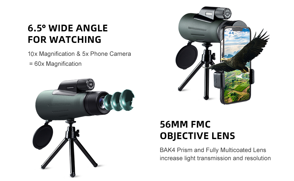 【10× Magnification & 56mm Objective Lens】Wide Angle 10× high power magnification, 24mm eyepiece & 56mm objective lens with 6.5° wide field of view monocular bring clearly 399ft/1000yards large field of view. The larger and comfortable view of the monocular help easily track moving targets outdoors such as hunting, bird watching, stargazing, etc.