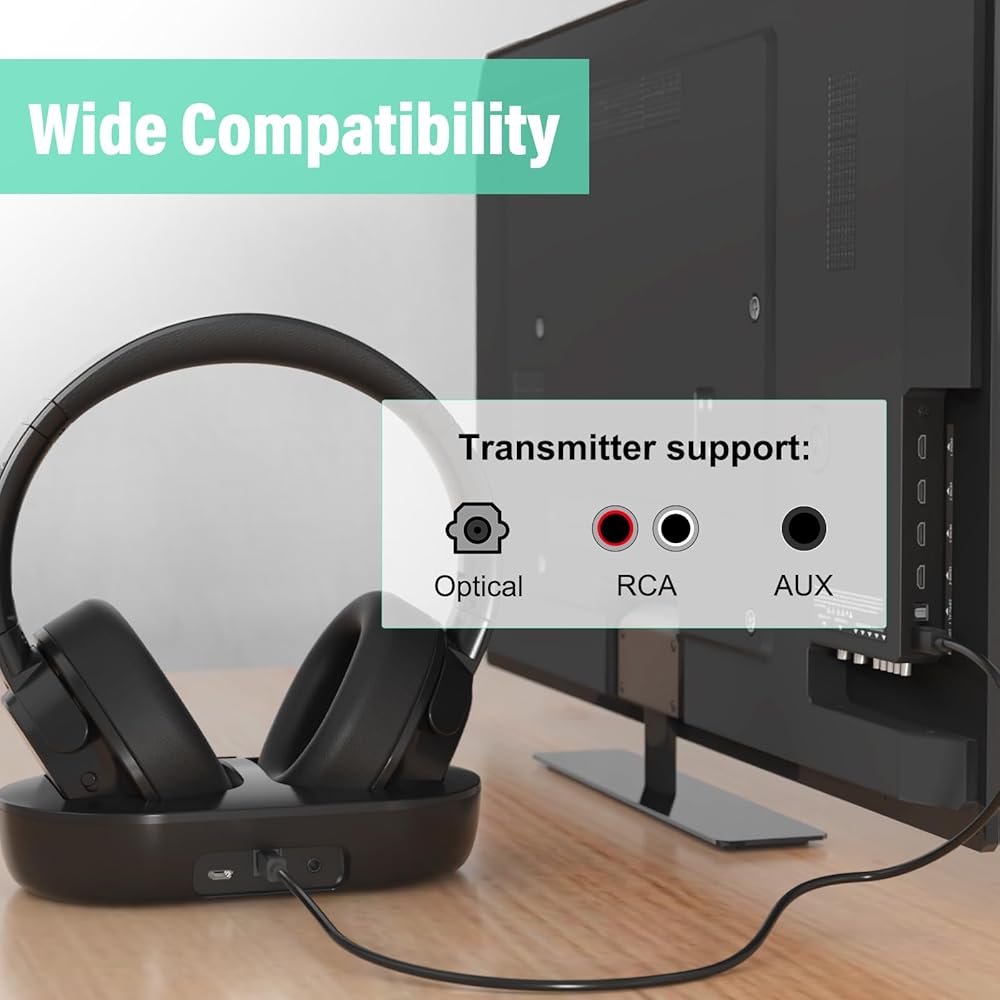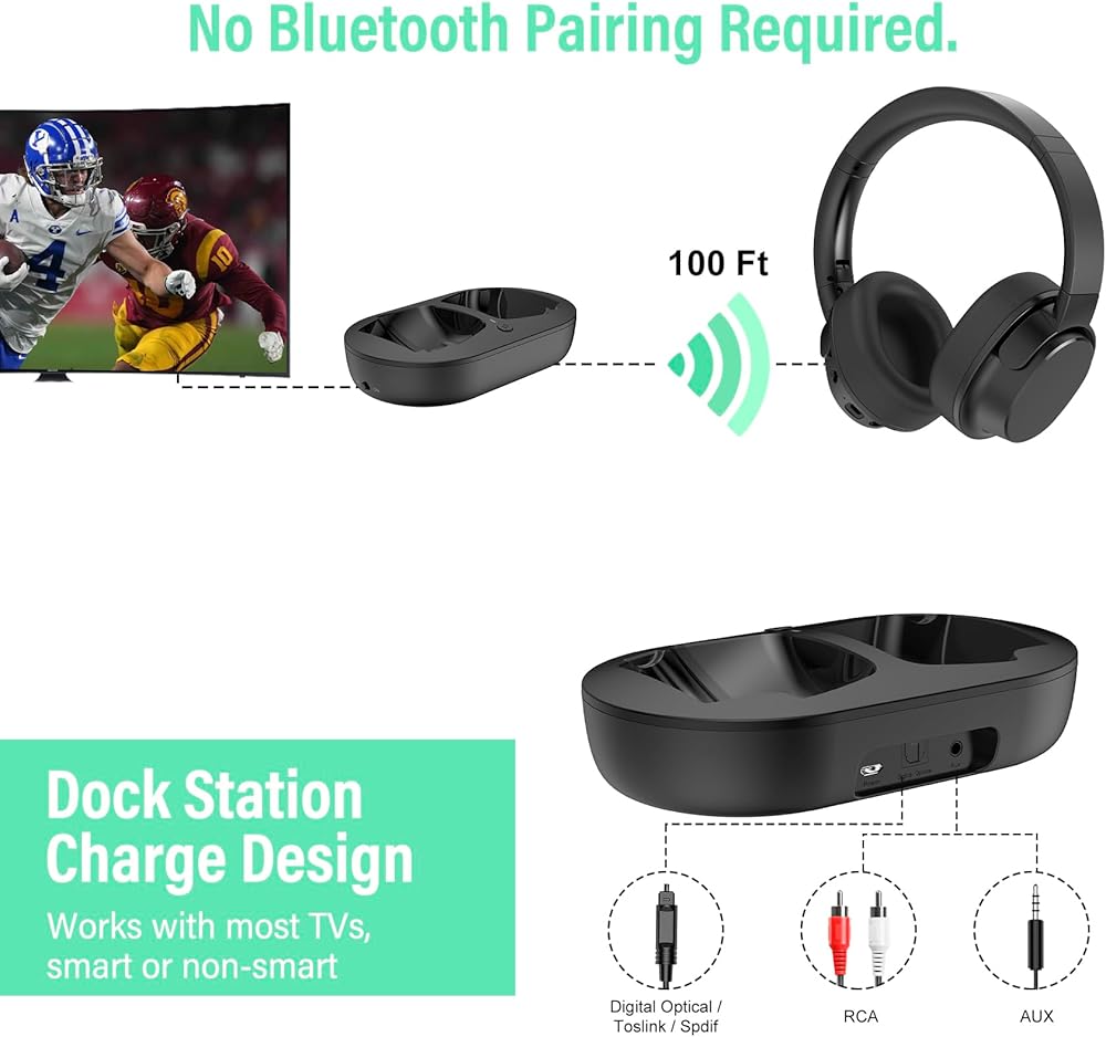 MONODEAL Wireless Headphones for TV Watching with Digital Optical RCA AUX Bluetooth 5.1 Transmitter & Charging Dock, Over Ear Headset for Seniors, 100ft Range, 30Hrs Playtime, No Lip-Sync Delay