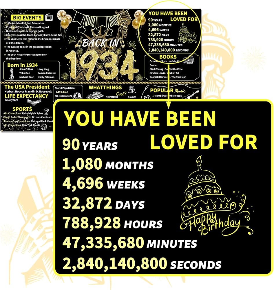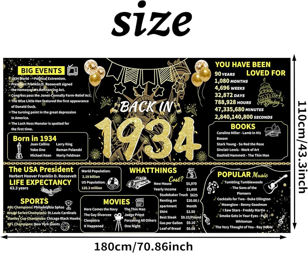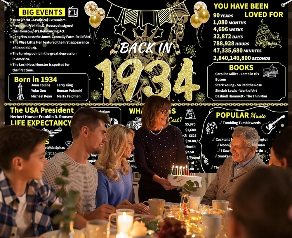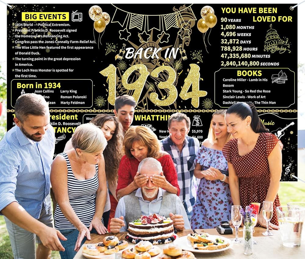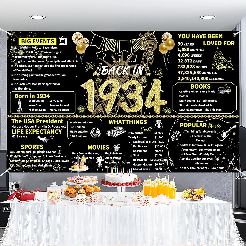 ArtAubrey Black Gold 90th Birthday Party Banner, 90th Birthday Decorations for Women Men, Back in 1934 Backdrop Party Supplies, 90 Year Old Photography Background