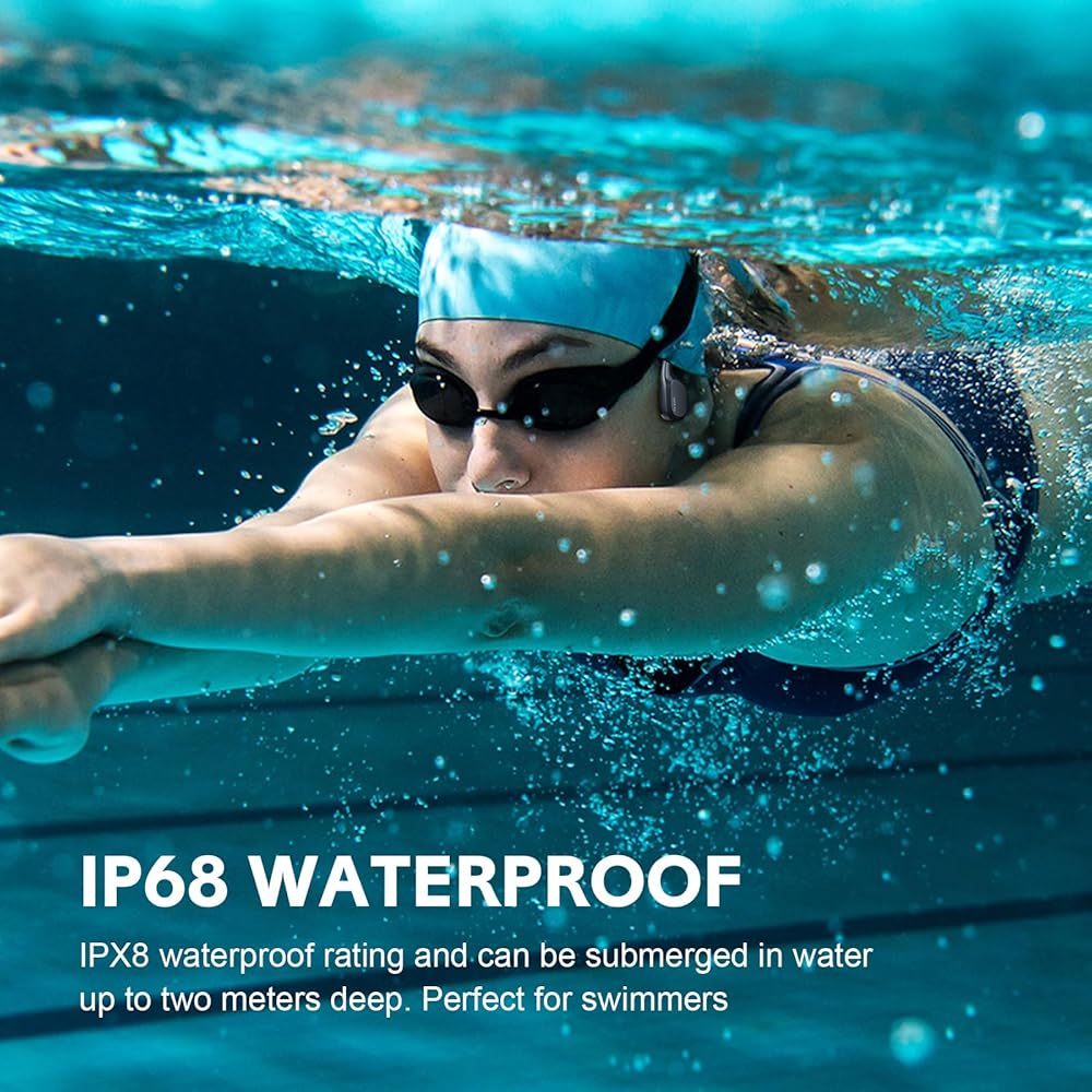 【IP68 Waterproof Designed For Swimmers】The swimming headphones has an IP68 waterproof rating, are fully waterproof and submersible so you can swim, run, cycle, or train harder than ever. Running headphones have internal 16G storage for a library of up to 5000 songs. Device-free listening, go out easily.