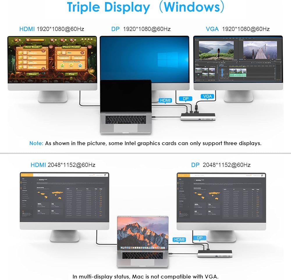 4K HDMI & Triple Display -Three different display interfaces meet different needs. Mirror or extend your screen with HDMI, DP port and directly stream 60Hz for 4K ultra-high-definition video to a high-definition TV, monitor, or projector for a visual feast like a movie. A single HDMI/DP can support up to 4K at 60Hz under DP1.3 source. The resolution will be 2K@60Hz if two monitors are playing at the same time, then 1920x1080@60Hz when using 3 display mode
