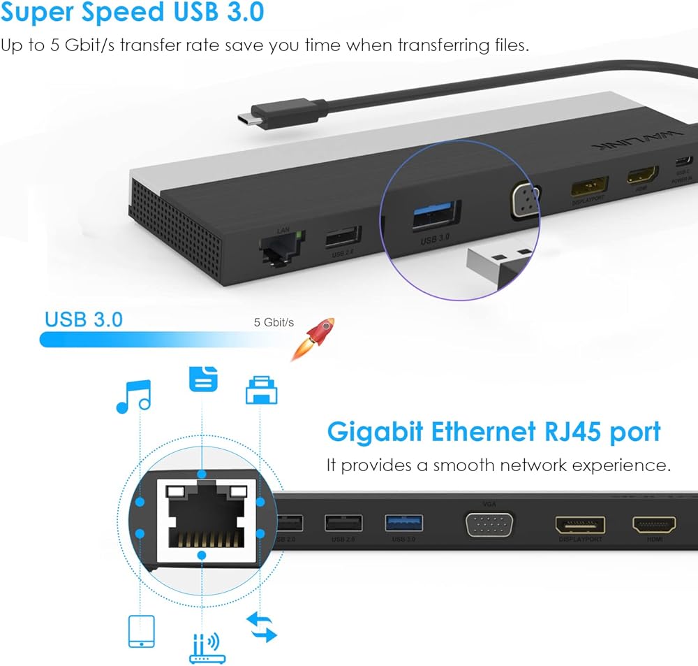 WAVLINK USB C Dock - USB C Hub has 1x4K HDMI, 1x4K Display Port, 1x2K VGA, 1000M RJ45 Ethernet Port, Type C PD 3.0 charging port, 2xUSB 3.0 Ports, 2xUSB 2.0 Ports, 3.5mm Audio Jack, and SD & Micro SD card reader.