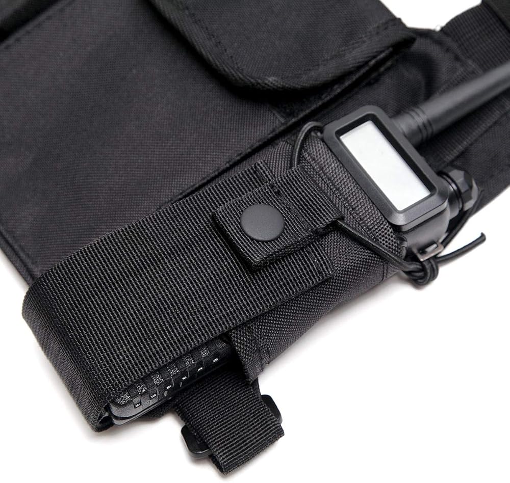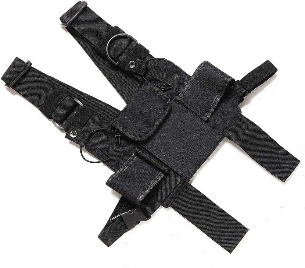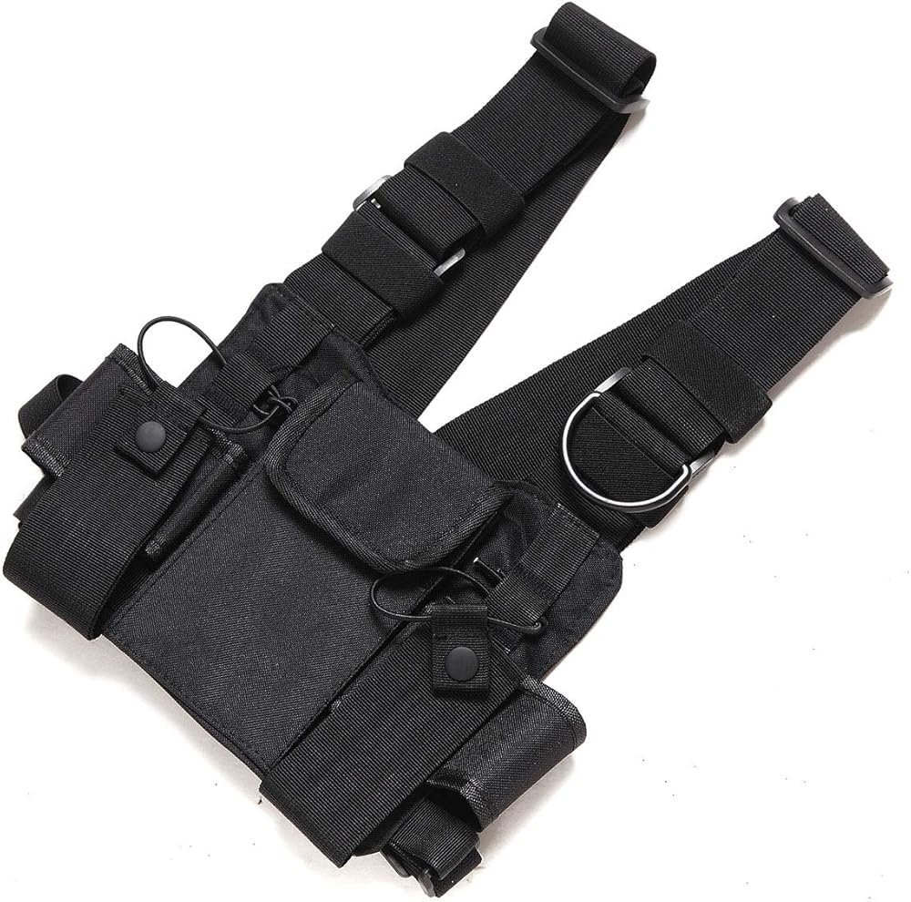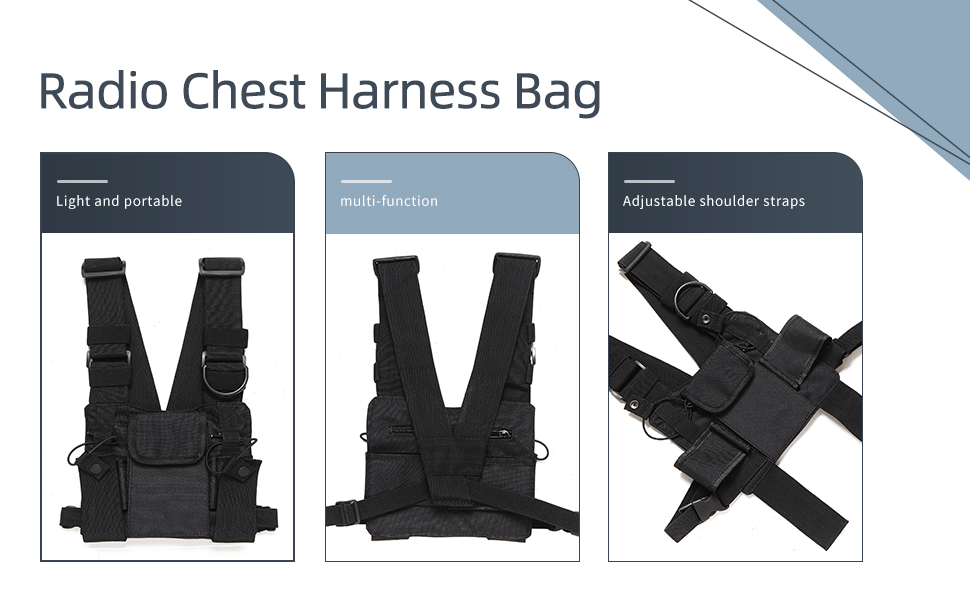 Adjustable shoulder straps, suitable both men and women, Both pockets adjust in length and girth , so you can put your primary radio on either side.