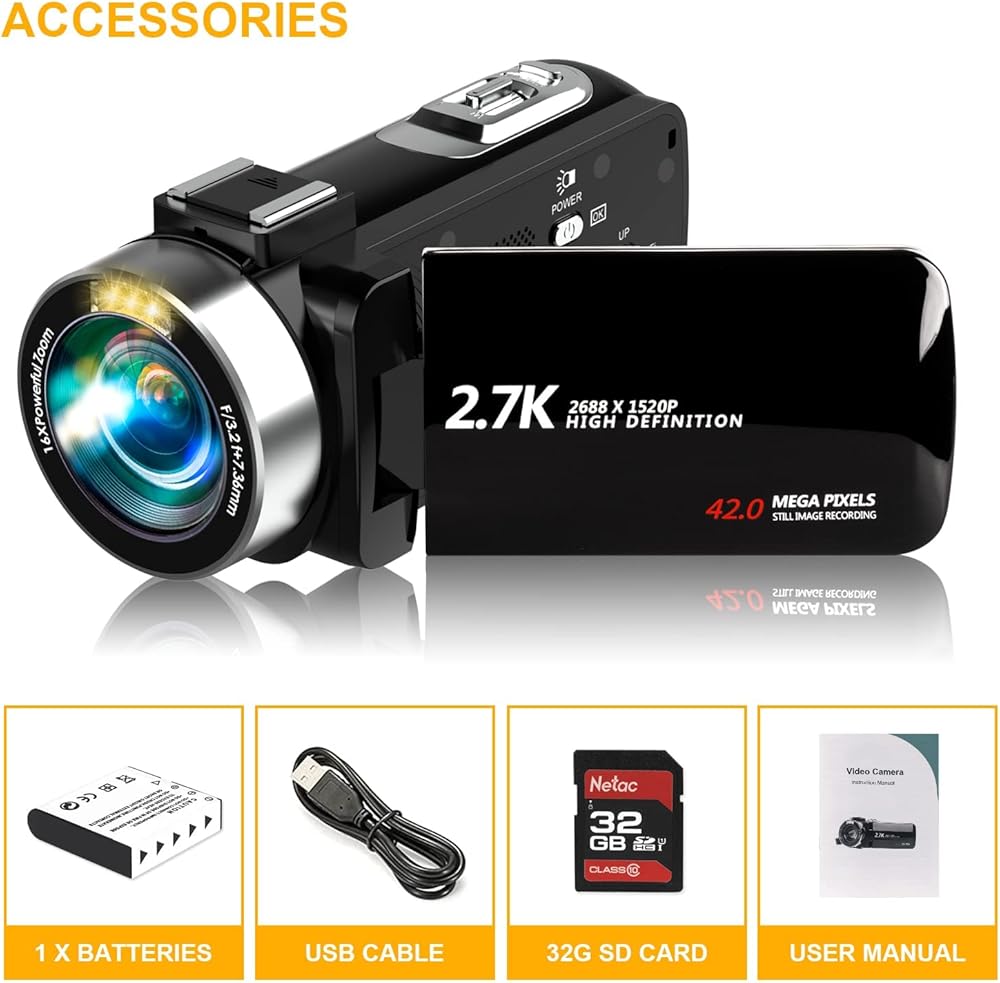 Vmotal Video Camera Camcorder Digital Camera Recorder 2.7K 42MP 3.0 Inch 270 Degree Rotation LED Light Vlogging YouTube Recorder 18X Digital Zoom with 32GB SD Card Kid Teens