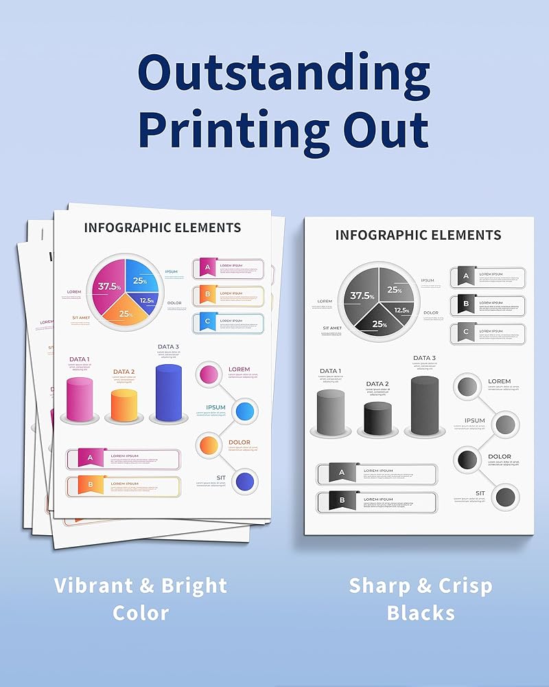 High print performance: The latest ink formulas are odorless, fast drying and boast vivid and smooth print performance. Minimizes ink leakage and reduces the risk of clogged print nozzles.