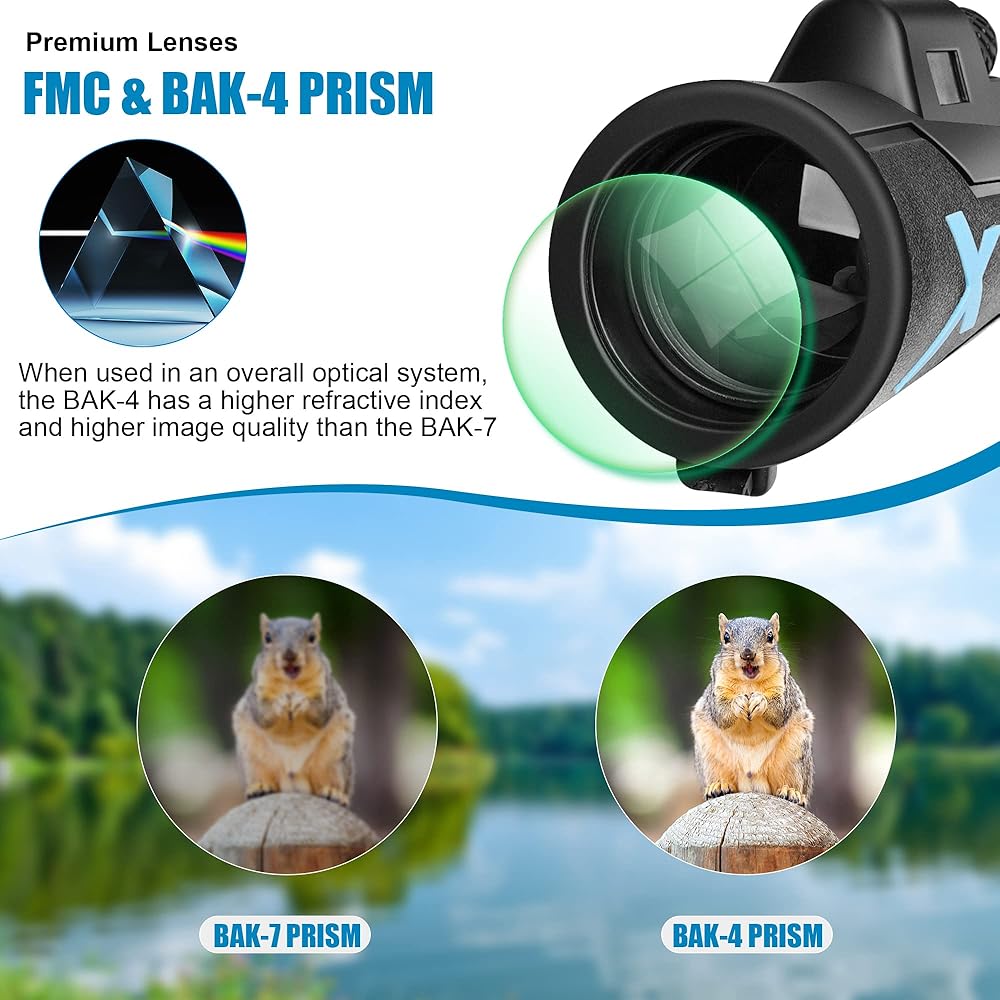 【High Resolution】The HD Monocular Telescope is equipped with BAK4 prisms and FMC fully multi coated lenses, It has the characteristics of clearness, high light transmittance, no discoloration of the picture, no deformation of the image, etc. After precise design, the light transmittance reaches 99.5%. Let you easily capture every crisp detail. Excellent material and design ensures that the monocular has a large field of view (360ft/1,000Yds), giving you the best view on your outdoor adventures