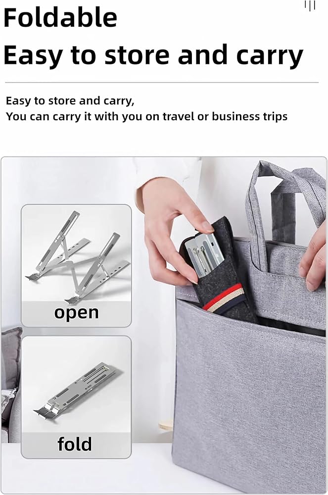 [Portable and Foldable]: You can fold the adjustable laptop stand, which is very light, so you can use the provided bag to take it to any place you like, such as in the office, library, or coffee shop< br>