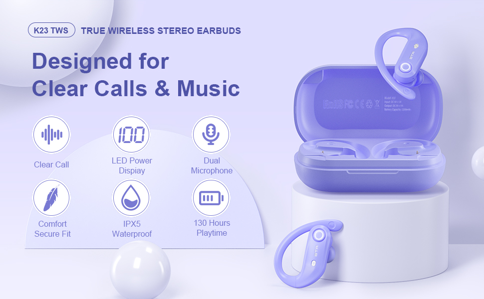 5. Auto Pairing and Press Button Control. Just pick up earbuds wireless bluetooth from charging case,they will power on and pair with each other automatically.Then enable the bluetooth of your phone to search “K23” to connect. After the first successful connection, the ear buds wireless bluetooth earbuds will automatically connect to the last paired device. Each earbud has one multi-functional press button which can make or receive call,play or pause,adjust volume and switch music accurately.