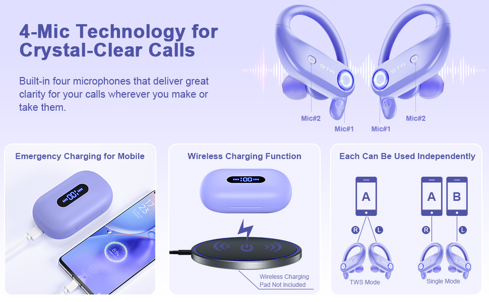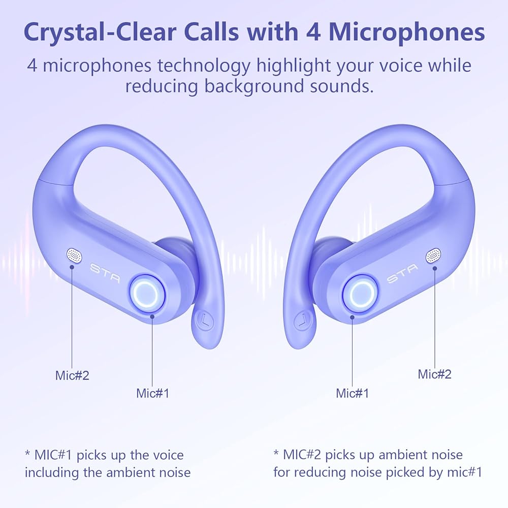 1. Four Mics Enhanced Call Performance. Each wireless earbud has built-in 2 microphones, 4 dedicated microphones can achieve precise voice pick-up and isolate external environmental noise through algorithms, make sure other people hear your voice clearly. Get clear calls anywhere you go. Design for business and commute.