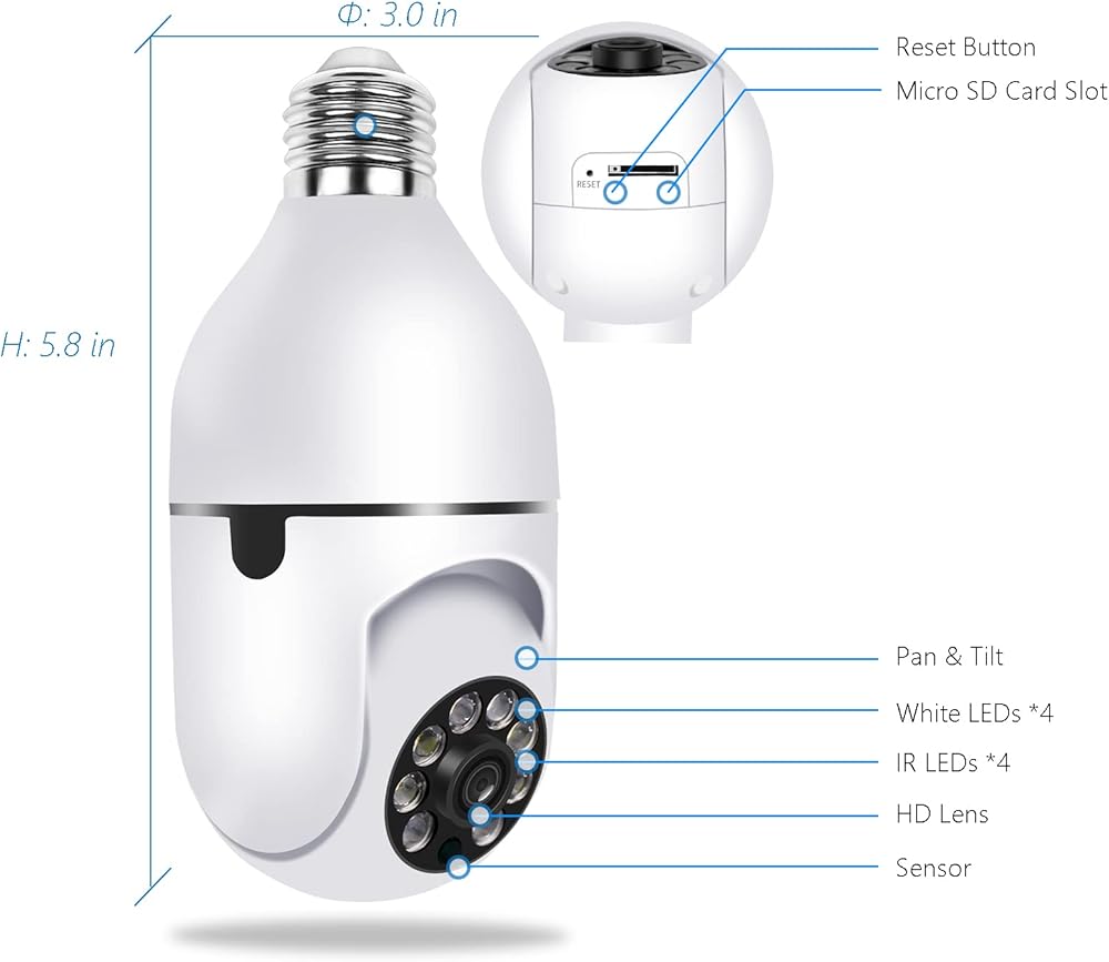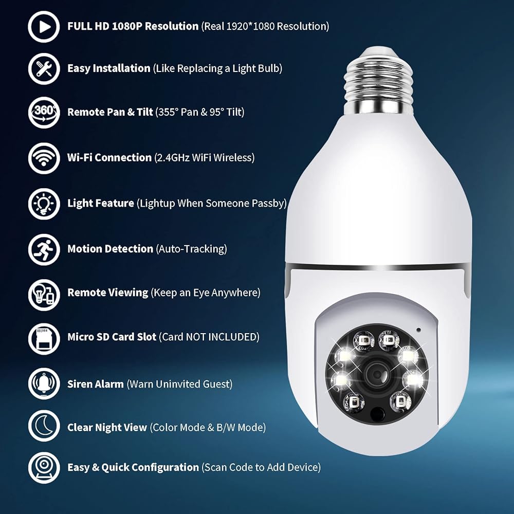 ➽Easy Installation & Setup➽ The installation is as easy as replacing a light bulb, drill-free, punch-free, and wire-free! It works with the E27 light socket, 2 minutes 2.4GHz Wi-Fi Setup!