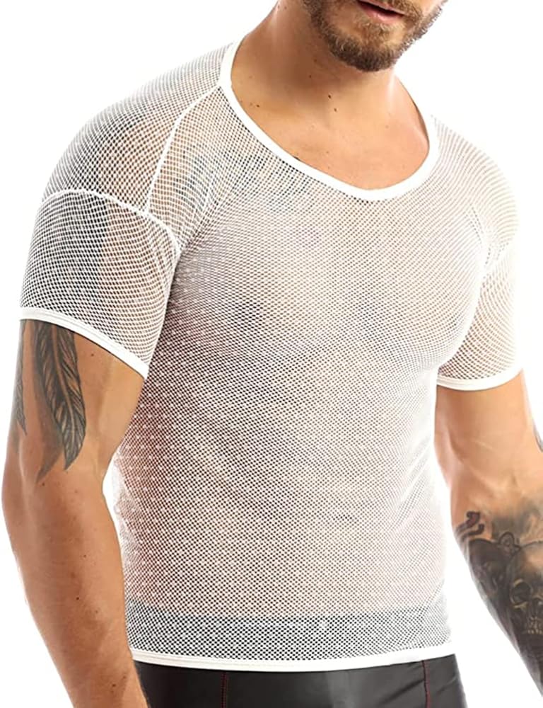 Men's See Through Shirts Fishnet Mesh Fitted Short Sleeve T-Shirts for Muscle Tops Clubwear