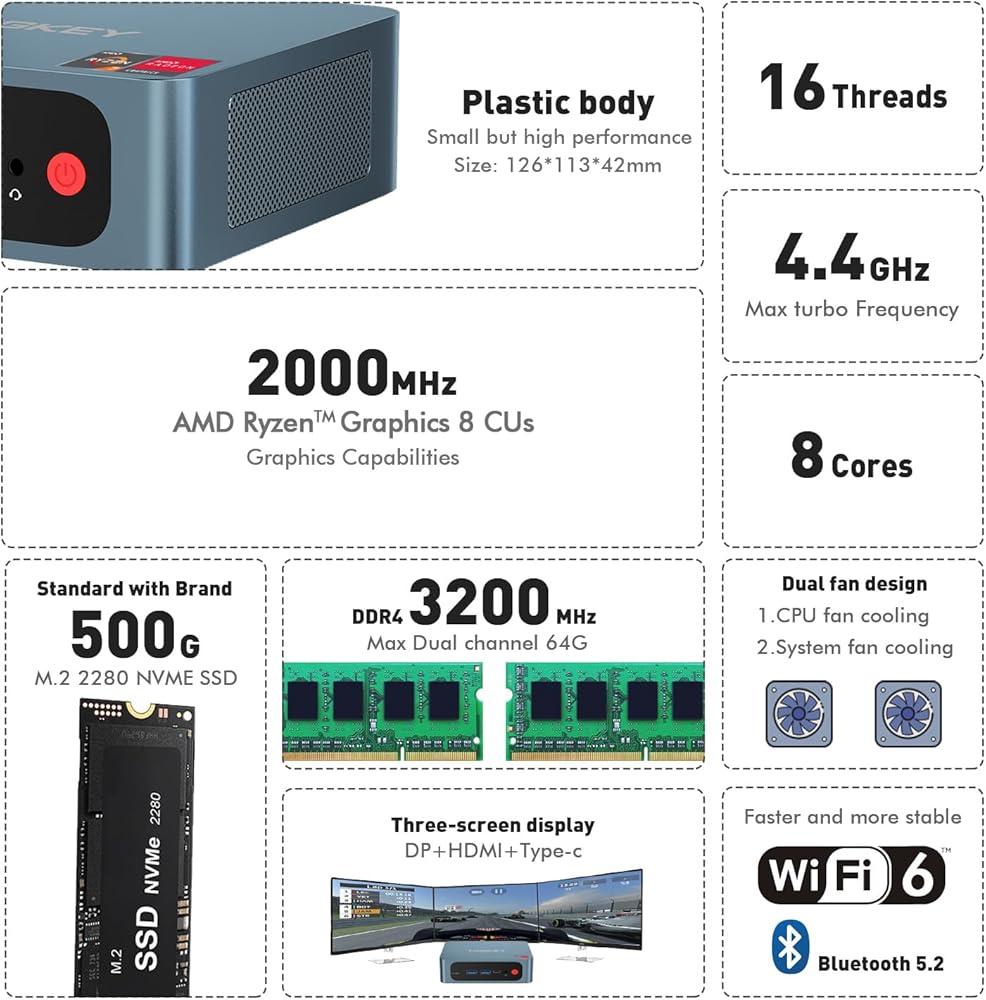 🚀【Mini PC Ryzen 7 5800H Processor【 The Mini Desktop Computer is equipped with AMD Ryzen 7 5800H processor, with a maximum frequency of 4.4GHz, 8 cores, 16 threads, and 16MB L3 cache. The 5800H chip equipped on the Mini Gaming PC is based on the "Zen 3" core architecture and 7nm technology. Compared with "Zen 2", the performance in multi-tasking processing is improved by 3.4%, whether in office design PS, PR, C4D R25, etc. The performance in games such as CSGO, GTA5, Apex Legends, etc. is not inferior.
