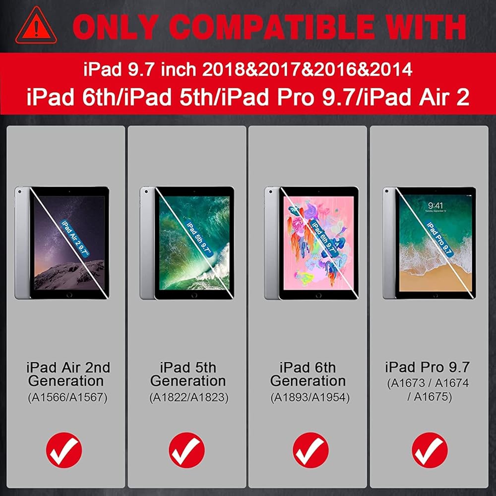 ➤【Compatible Models】Auizotl case 𝐎𝐍𝐋𝐘 compatible with iPad 6th/5th Generation 2018&2017(A1893/A1954/A1822/A1823) & iPad Pro 9.7 (A1673 / A1674 / A1675) & iPad Air 2 2014(A1566/A1567), Please go to "Setting"> "General"> "About"> "Model Number", click on the model number, then you will see the model number NOTE: This iPad 9.7 case WITHOUT built-in screen protector