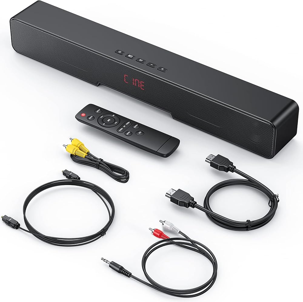 【UNIVERSAL DEVICE COMPATIBILITY】Whether you own a TV, PC, laptop, tablet, projector, or smartphone, this compact soundbar effortlessly connects to them through HDMI, Optical, RCA, AUX, or Coaxial cables (all included). You can also easily link other gadgets via Bluetooth 5.0 or USB ports, ensuring that you can enjoy your audio collection on any device hassle-free.