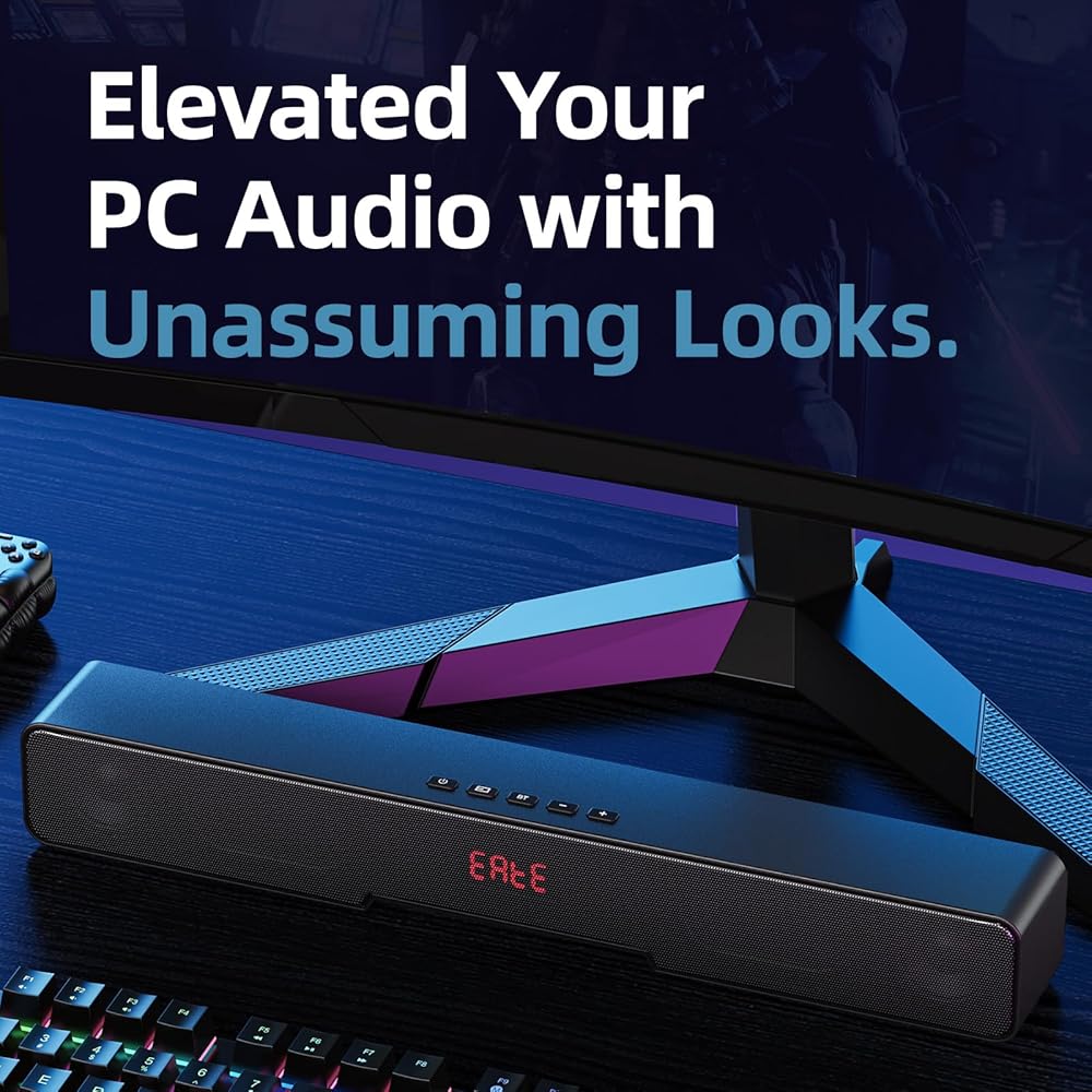 【TUNE YOUR SOUND】This compact mini soundbar boasts 4 EQ modes (Song, Flat, Cinema, Entertainment) to cater to your entertainment preferences. Easily switch between modes to subtly enhance your audio experience, whether you're gaming or watching movies. With adjustable BASS and TREBLE controls, you can fine-tune your sound for a more enjoyable listening experience.