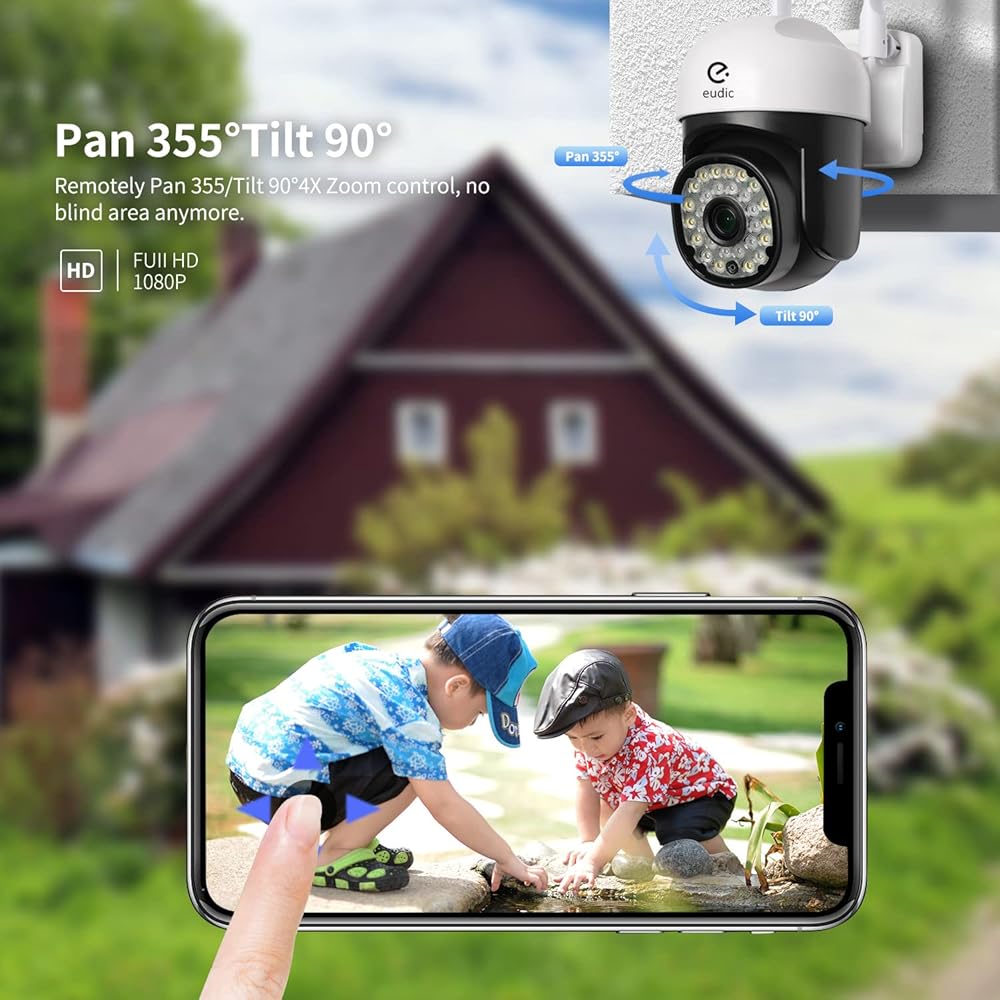 Human PIR Motion Detection - Security camera outdoor automatically senses and tracks the action outdoor in full 360°. Security Cam has wide field of view - rotates 355° horizontally,90° vertically with 4x digital zoom / Pan / Tilt / Zoom / Light / Talk / Playback easily with the App, whenever and wherever.Human detection reduces false positives of moving cars or leaves.