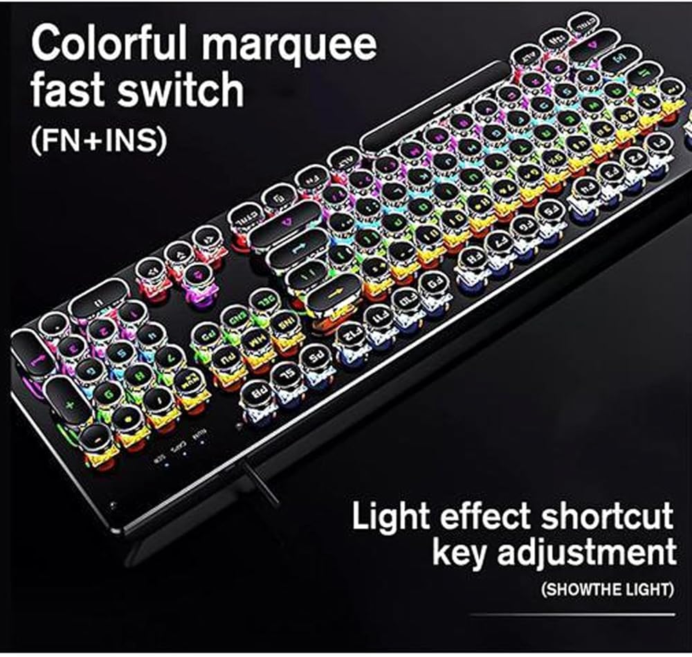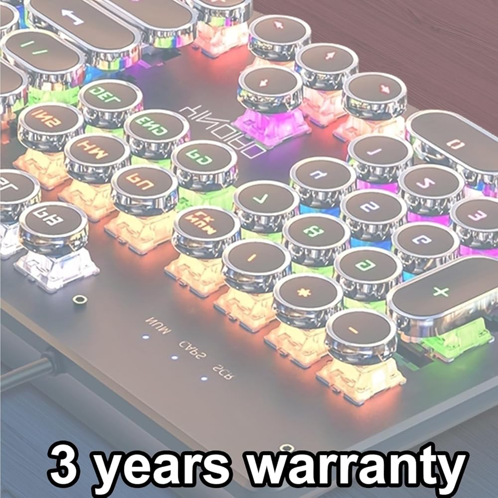 Retro Typewriter Style with Mechanical Keys: Mechanical blue switch for ultimate performance. The mechanical keys offer medium resistance, audible click sound & tactile feedback. Vintage steampunk round keycaps looks like a classical typewriter, brings you comfortable typing feeling & stable clicking touch. All 104 Keys Anti-Ghosting:104 keys full size keyboard, and all keys non-conflict. Every keystroke is registered and fast typing, no matter how many other keys are pressed at the same time. Let you enjoy high-grade games with fast response PC Gaming Keyboard Compatibilty:Support computer systems including Windows, Linux and Mac OS. Plug and play. No drivers or softwares are required. Laser Engraving Technology:Laser engraving technology ensures that the LOGO will not fade. The fashion retro steampunk keycap uses a two-color injection molding process, anti-fading, str'ong wear and tear away from the long-term use of character fade trouble
