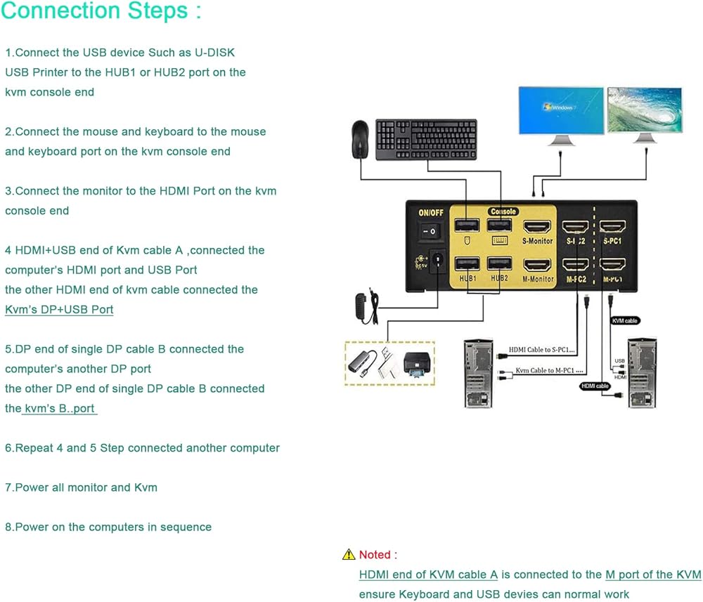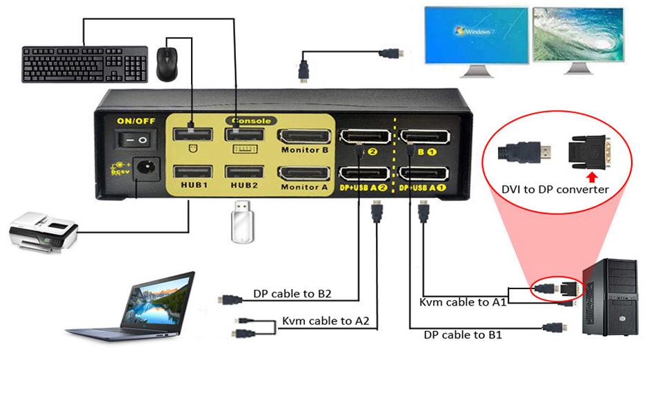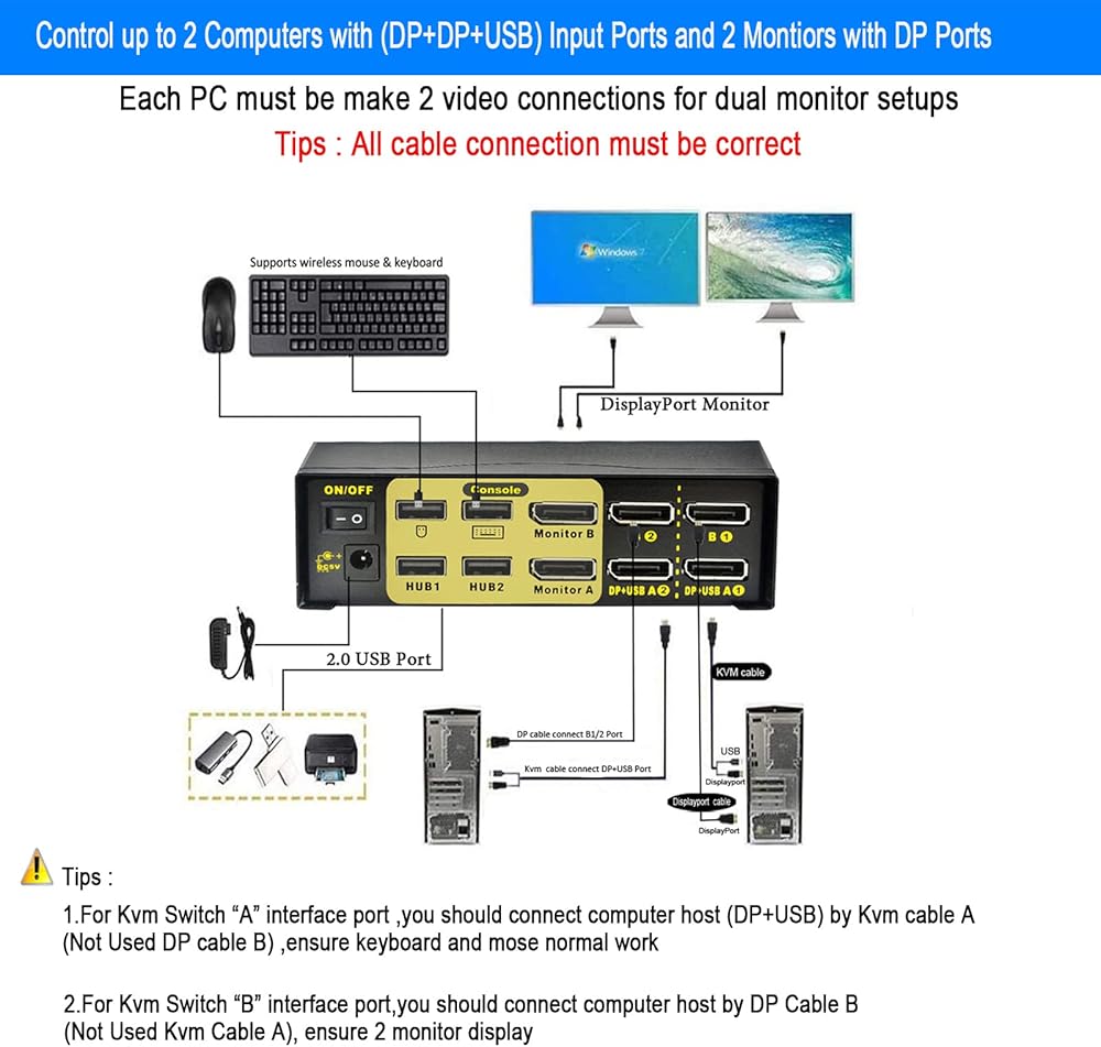 ♛【Note 2】Correct operation is each computer has 2 cables(kvm cable and displayport cable) to connect with dual monitor kvm switch. Note: The Kvm cable's Displayport sides needs to be connected to the A port (Not B port) of the kvm switch to ensure the normal operation of the mouse and keyboard.Kvm cable's displayport+USB sides must be connected to same PC
