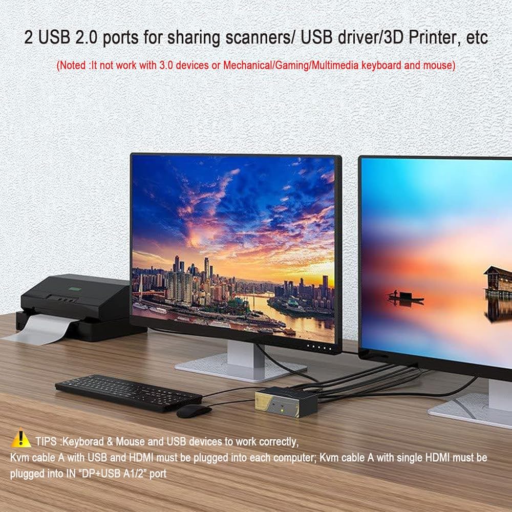 ♛【2.0 USB HUBS &High Compatibility 】dual monitor switch for 2 computers has with 2 extra USB HUBS to for sharing scanners/ USB driver/3D Printer;Driver free,Plug and play(Tips :It not support 3.0 USB devices and multimedia /mechanical/game mouse and keyboard ).it best dual Monitor KVM can control 2 PCs share 2 monitors
