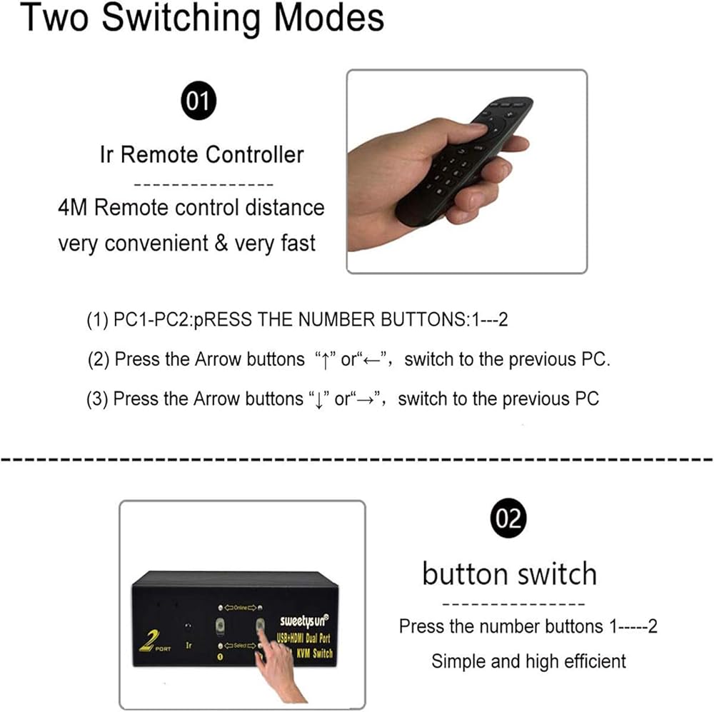 ♛【SWITCH TWO WAY 】The kvm switch 2 monitors 2 computers via button switch and IR signals and Auto scan switch .only need 3 seconds to switch, anytime, anywhere,convenient and fast (Noted battery not included)