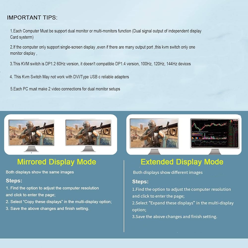 ♛【Note 1】This dual-monitor KVM switch requires each computer to have 2 displayport output ports and supports extended display.If your computer only supports single display, then this product cannot help you get dual display function.