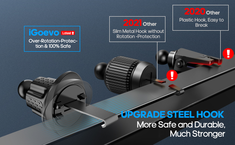 👍【Unique Design】: With mechanical screw lock design, [wider and longer adjustable hooks and anti-over-rotation design, which snaps the air vent blades tightly in place for more stability and true durability] it can hold your phone securely to the vent and prevent your device from falling. Also, iGoevo vent clip has a soft anti-slip sillione pad that will not damage the blades of the car's air outlet and protect your air vent from scratched.