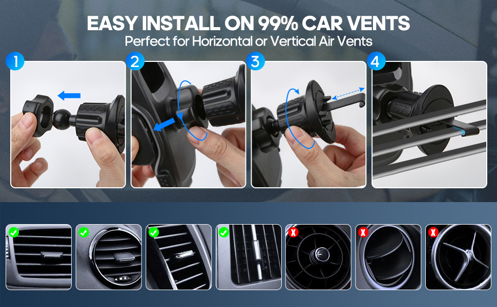 👍【Easy to Install】: Thanks to the special design of the clip-on bracket, the installation of this car bracket is quite easy, just put it on the blade of the air vent of your car, and then adjust the length of the hook by rotating the knob, so that it can match the air vent (the hook can be rotated 360°). Then finish the installation. Installation or removal is easy and takes only a few seconds.