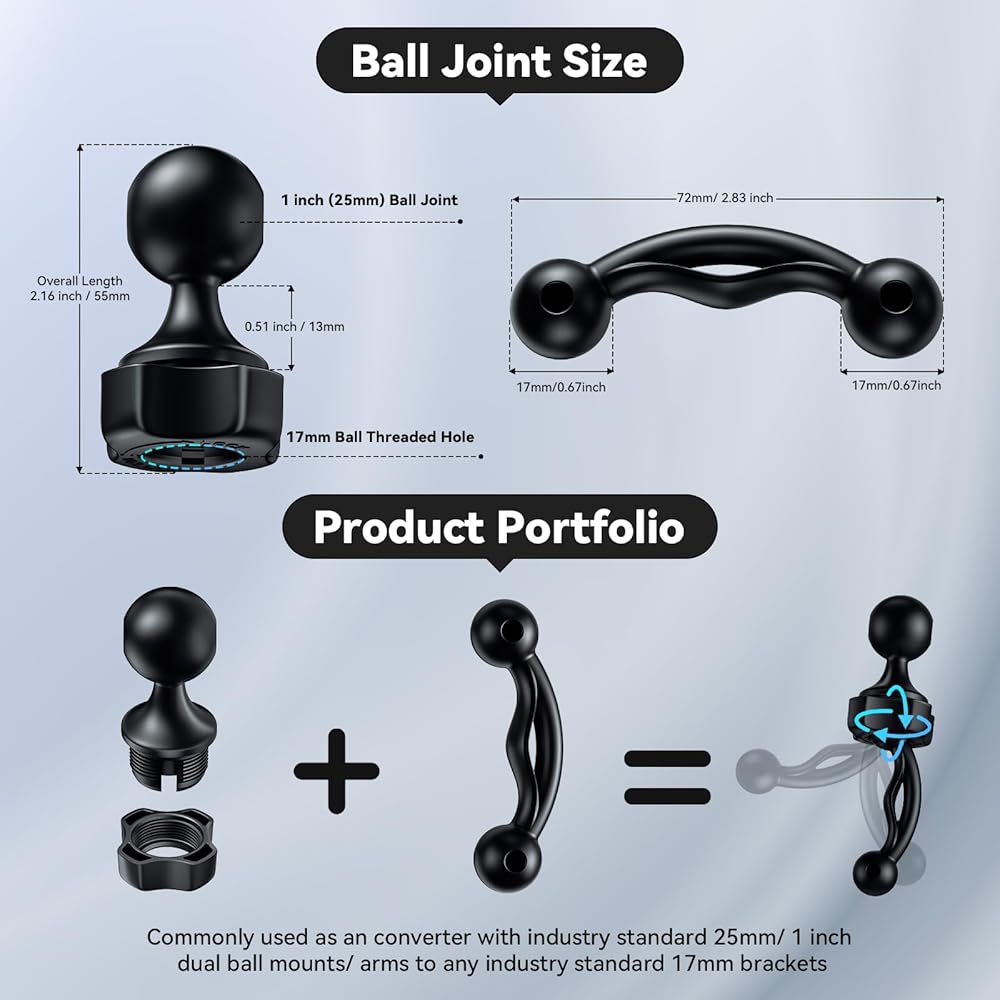 👍【Use Separately】: 1 inch/ 25mm ball joint compatible with RAM Mounts B size 1'' ball double socket arm and other industry standard 25mm / 1 inch dual ball mounts / arms. 17mm ball head perfect compatible with Garmin GPS Mount 17mm Swivel Ball Mounting Pattern.