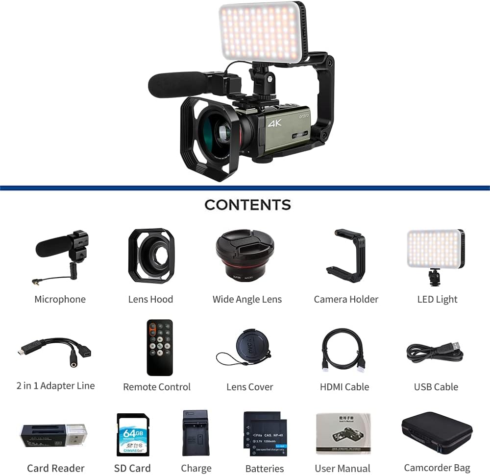 ORDRO Video Camera 4K Camcorder AX65 12X Optical Zoom HD 1080P 60FPS Digital WiFi Camera Livestreaming Camcorder with Microphone, Video Light, Wide Angle Lens, Camera Holder and Storage Bag