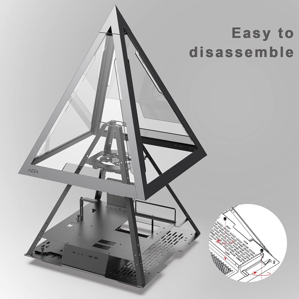 Upgraded to be compatible with the influx of large graphics cards, the Pyramid L is the latest version of the iconic Pyramid case built for greater hardware compatibility. Maintaining its appearance and size, the Pyramid L has been adjusted to allow for more fan ports and graphics cards up to 330 mm. It also comes included with an AZZA Hurricane III 120 mm ARGB Fan in the top fan port to illuminate the interior of the case. The Pyramid L is perfect for those looking to pack some serious hardware into a truly unique and eye-catching PC case.