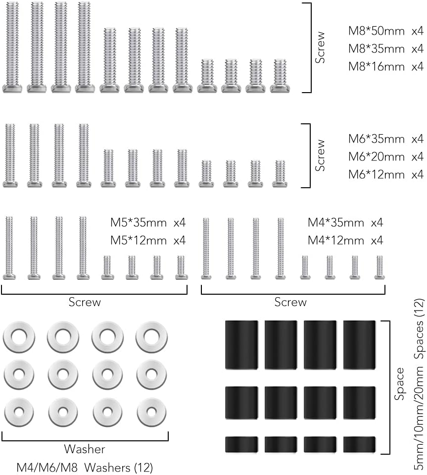 PACKAGE INCLUDED - SCREWS: M4 x 12mm Screws(4), M4 x 35mm Screws(4), M5 x 12mm(4), M5 x 35mm Screws(4), M6 x 12mm Screws(4), M6 x 20mm Screws(4), M6 x 35mm Screws(4), M8 x 16mm Screws(4),M8 x 35mm Screws(4), M8 x 50mm Screws(4),Washers: M4/M6(4) and M8(4), Spacers: Φ8x5mm(4),x10mm(4)and x20mm(4).