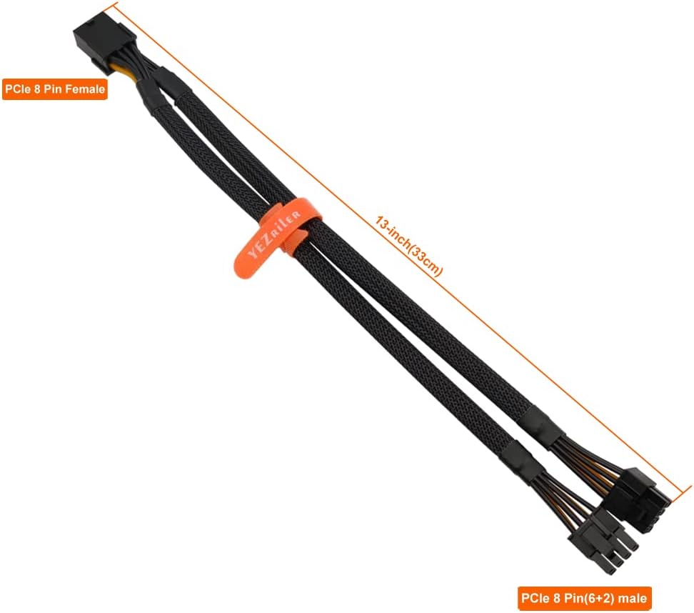 The YEZriler 8 Pin female to dual 8 Pin (6+2) PCLe Sleeved Y-cable is to provide a convenient solution for adding two extra PCI Express connectors to your existing power supply;