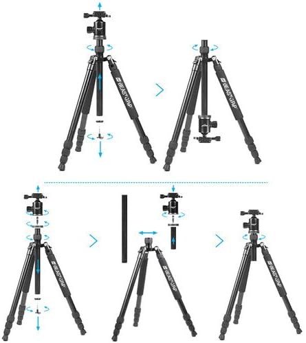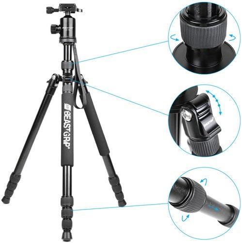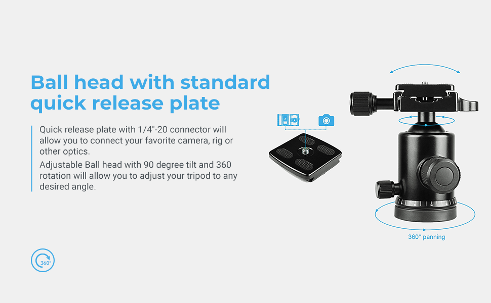 Ball head includes quick release plate for swapping cameras on the fly and allows you to pan a full 360° and tilt/pan 90° to get the perfect angle for your shot