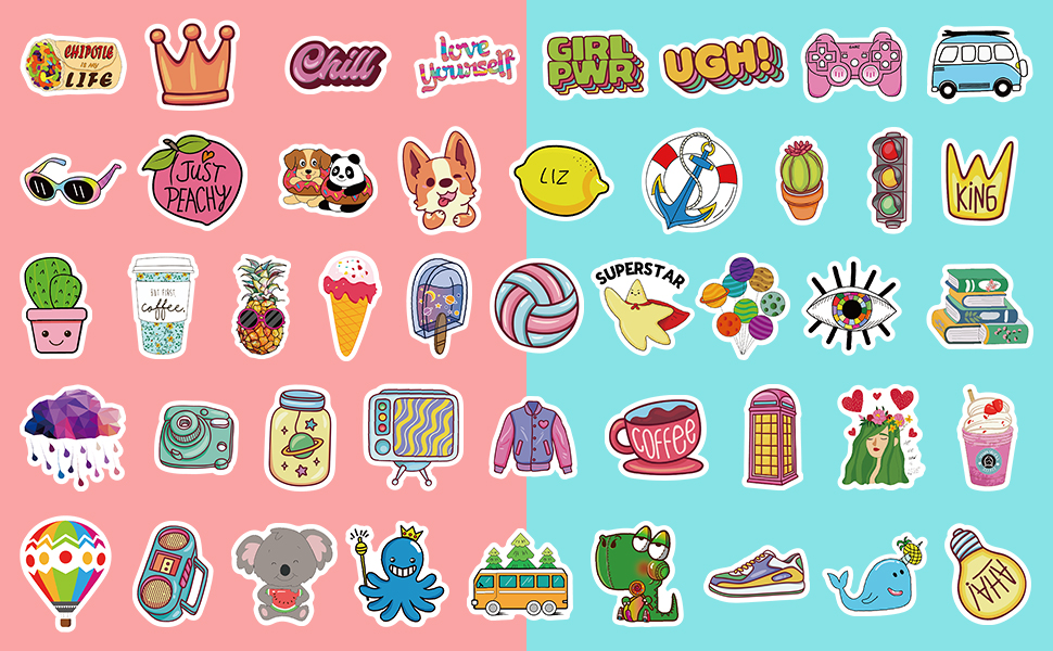 4.Reusable Cute Stickers: The colors of the stickers are super bright and vivid. The random stickers are waterproof, they are very adhesive and they don't come off from your water bottle when you wash it. Last but not least, these vinyl stickers are reusable. You can peel off the sticker on the computer and stick it on the phone case.