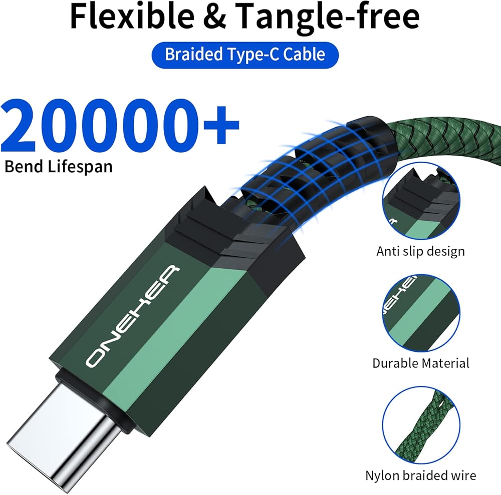 [ Military grade material ] : Strong military fiber, the most flexible, powerful and durable material, makes tensile force increased by 200%. Special Strain Relief design, can bear 10000+ bending test. Premium Aluminum housing makes the cable more durable.Premium nylon braided type c cable adds additional durability and tangle free.