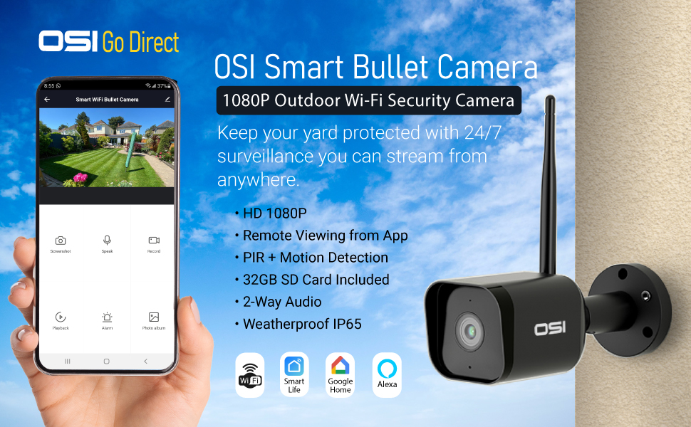 OSI Smart Security Bullet Camera Outdoor 1080P HD,WiFi Cameras, Home Security Cameras, AI Human Detection, Two-Way Audio, Night Vision,Compatible with Alexa, Google,32GB SD Card Included/Cloud StoragE