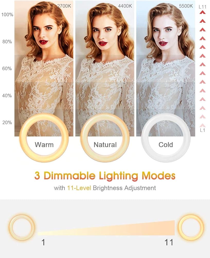 【Adjustable Brightness & Angle】3 colors lighting mode: warm (2700K), Natural (4400K), Cold (5500K). Each lighting mode has 11 level adjustable brightness and 360° angle, get the best angle to light up your beauty, it perfectly meets your different needs.