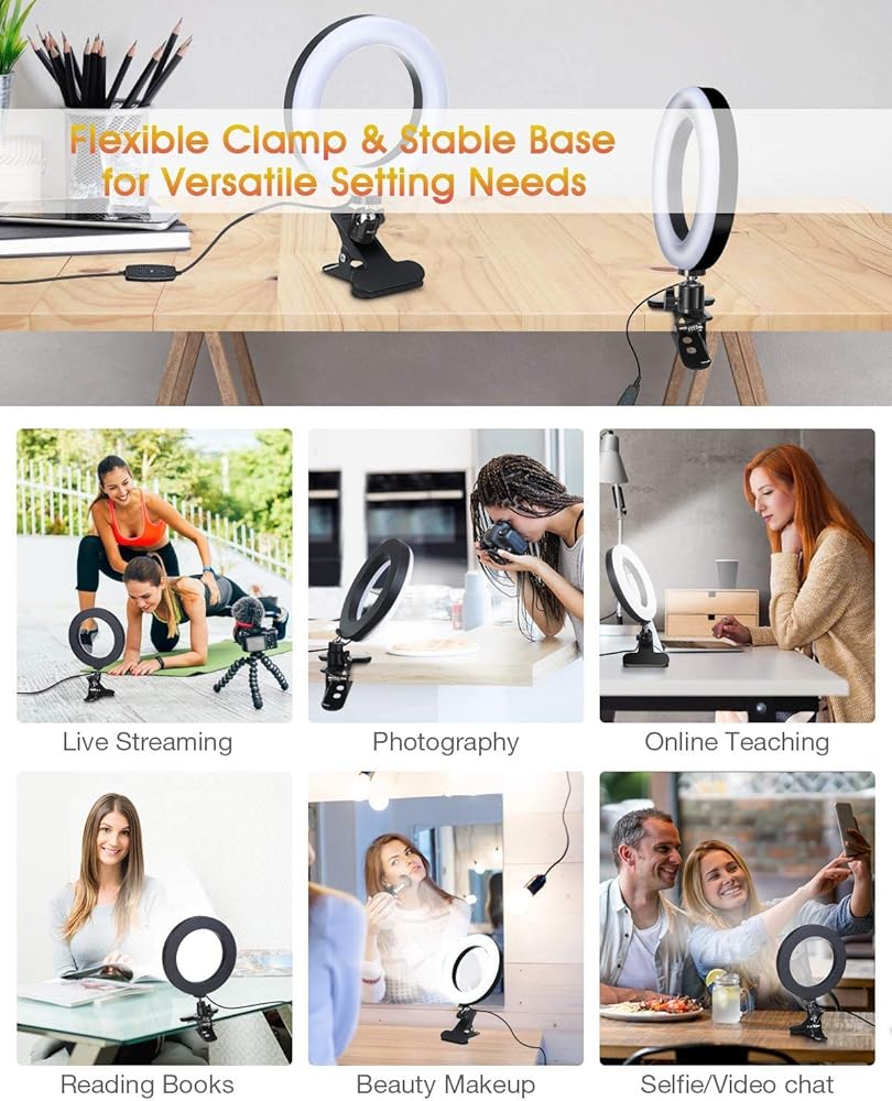 【 Two Type Holders, Stable Clamp & Hands-Free】With an anti-scratch metal mounting clamp and a tripod stand, just simply clip this selfie ring light on your bed, desk, office, conference table, and anywhere you desire. The metal clip is covered with thick silicone so it won't scratch your devices.