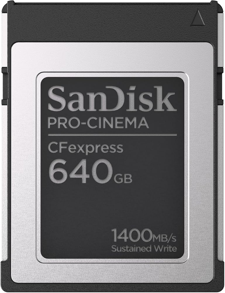 The SanDisk PRO-CINEMA CFexpress Type B card delivers the professional performance cinematographers demand today. With minimum sustained write speeds of 1400MB/s, it supports high frame rates for flawless 8K video. Its burst write speeds of up to 1500MB/s and read speeds of up to 1700MB/s are ideal for capturing high-resolution images in continuous burst mode and completing high-speed transfers. (Based on internal testing; performance may be lower depending upon host device, usage conditions, and other factors. 1MB=1,000,000 bytes. 8K (7680x4320) video support may vary based upon host device, file attributes, usage conditions and other factors. See official SanDisk website.)