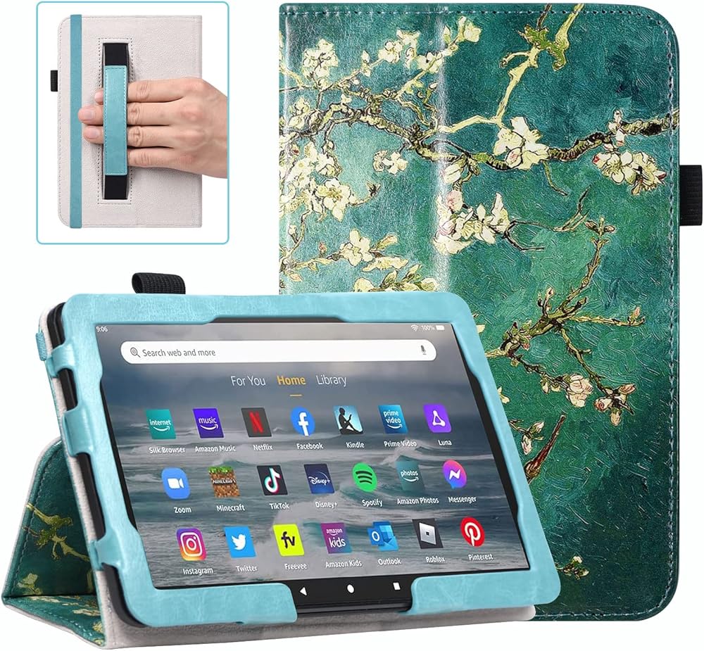 DMLuna Case for All-New Amazon Fire 7 Tablet 12th Generation, 2022 Release, Premium Smart Protective Lightweight PU Leather Auto Wake Sleep Cover, with Folding Stand, Hand Strap, Almond Blossom