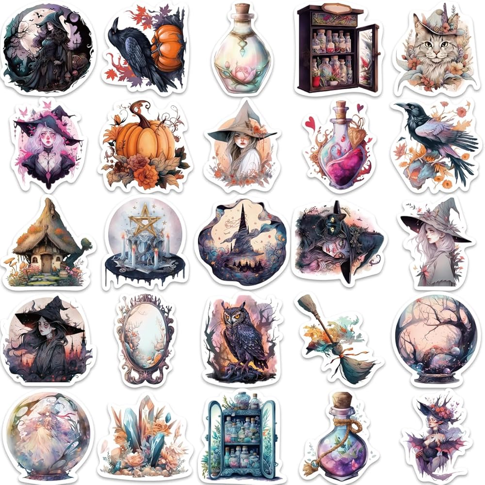 50Pcs Witch Stickers for Water Bottle, Waterproof Vinyl Sticker Decals for Laptop, Hydroflask, Cups, Suitcases, Skateboard, Phone, Notebooks, MacBook, Anime Vintage Stickers for Adults