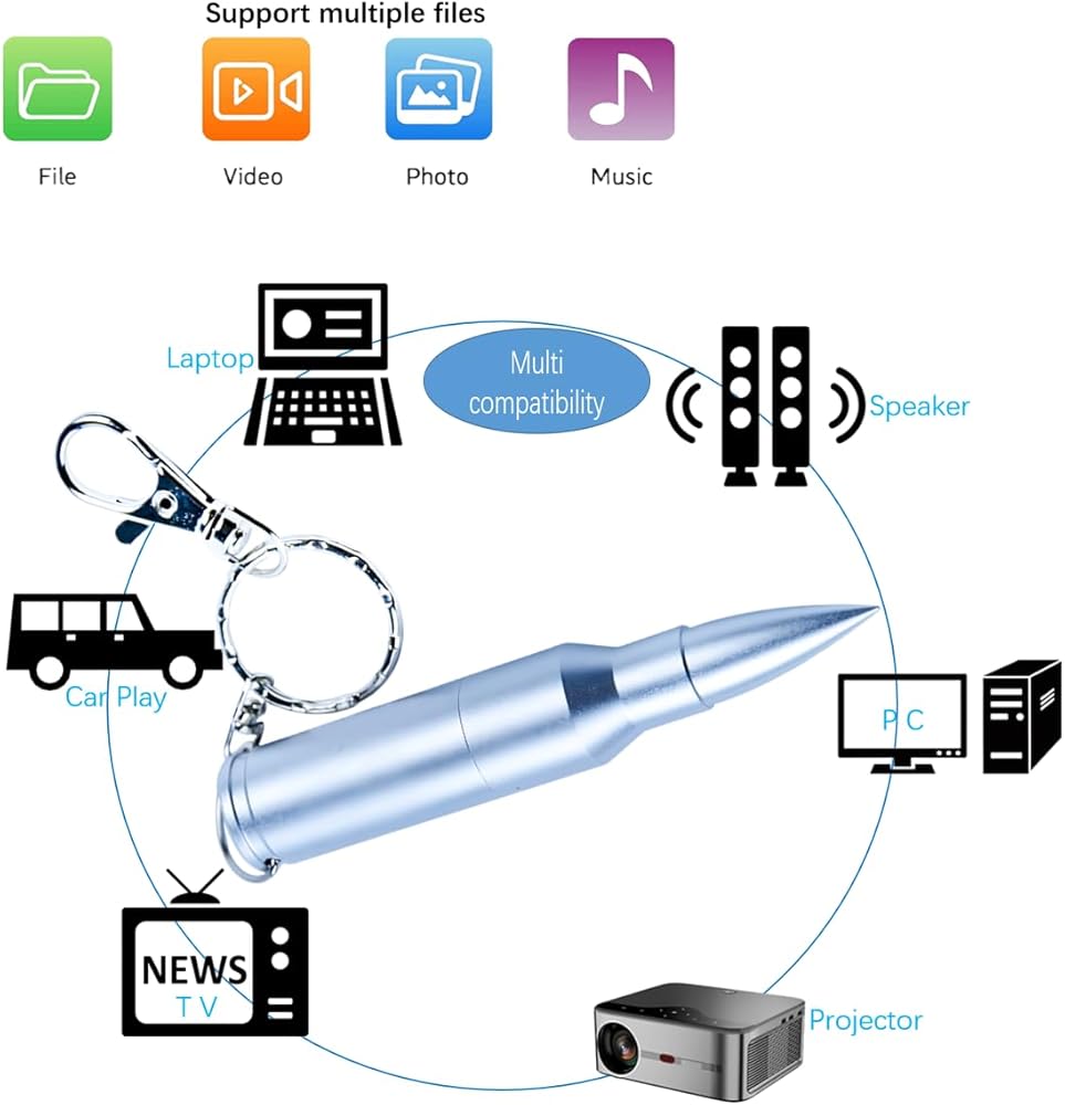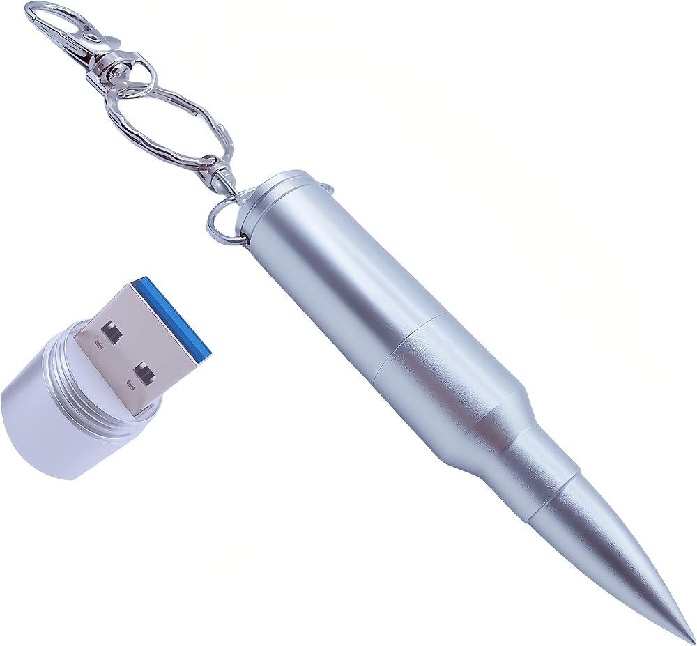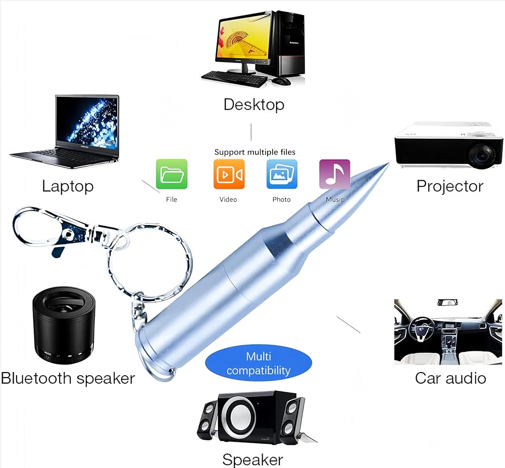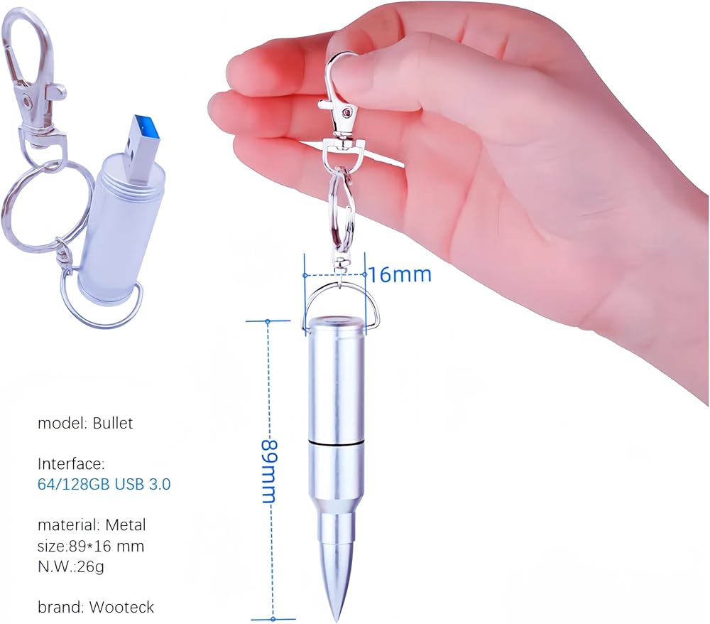 Metal 3D bullet Shape and easy to use. Just plug and play into a USB port