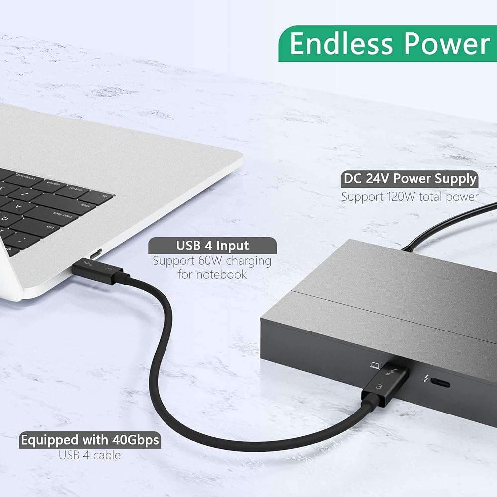 Dock provides usb-c power delivery up to 60W maximum of upstream charging to host computer and also power to the others peripherals simultaneously with 15Watt Power Adapter.