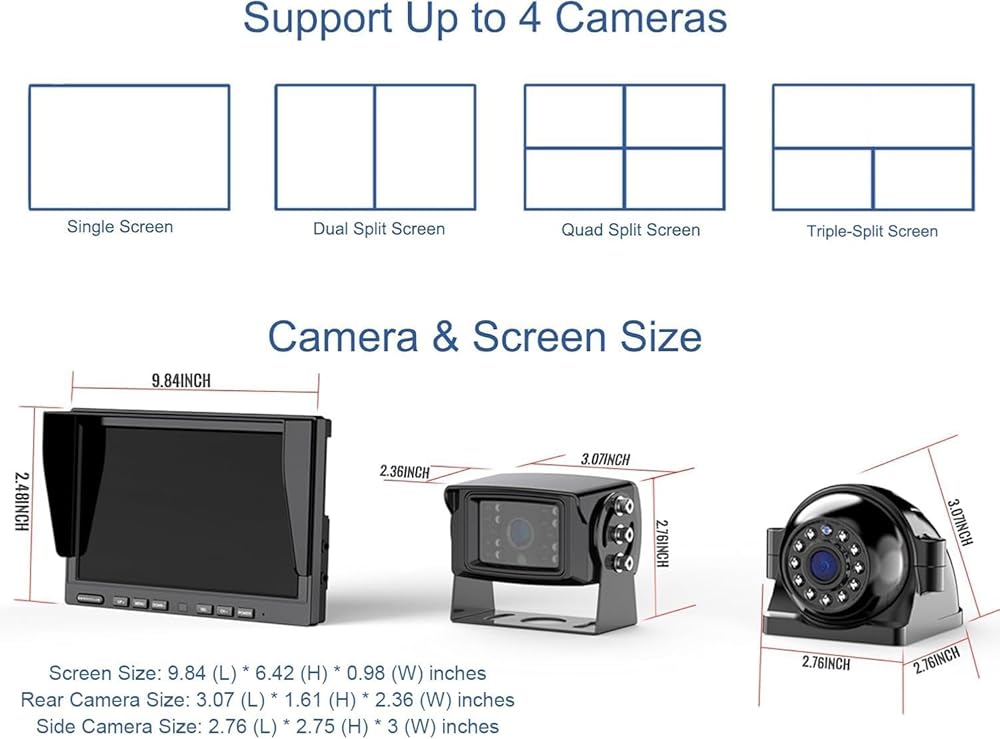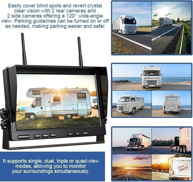 ☆【Side View Wireless Backup Camera & Recording】Built-in 32G SD card, can record thing on driving, Side View Camera fits the side better and cover the Blind Spots/Blind Zone. Support Single View Dual View or Quad View(CH1/CH2/CH4), you can switch to the mode you need.