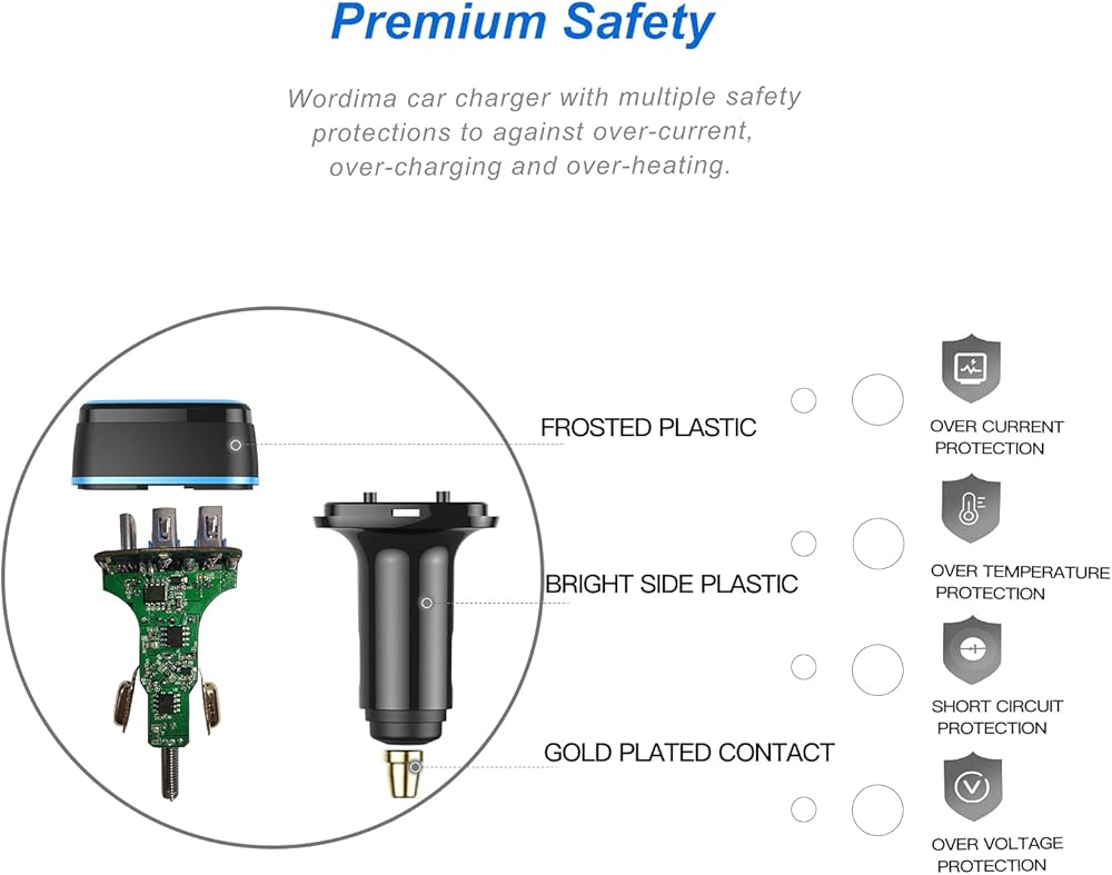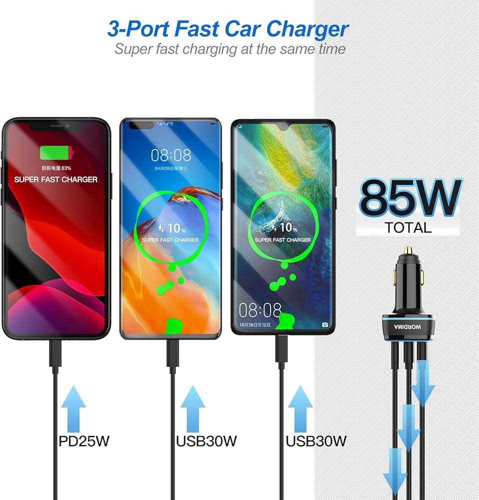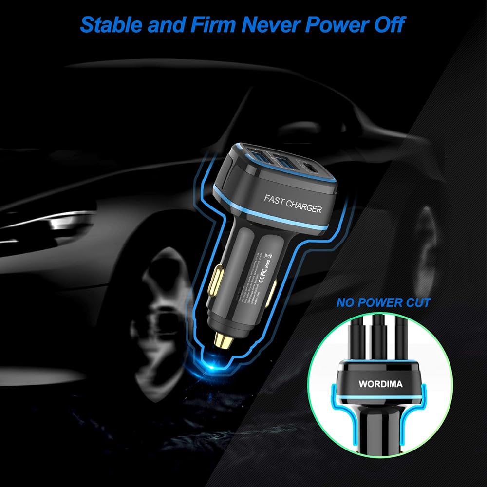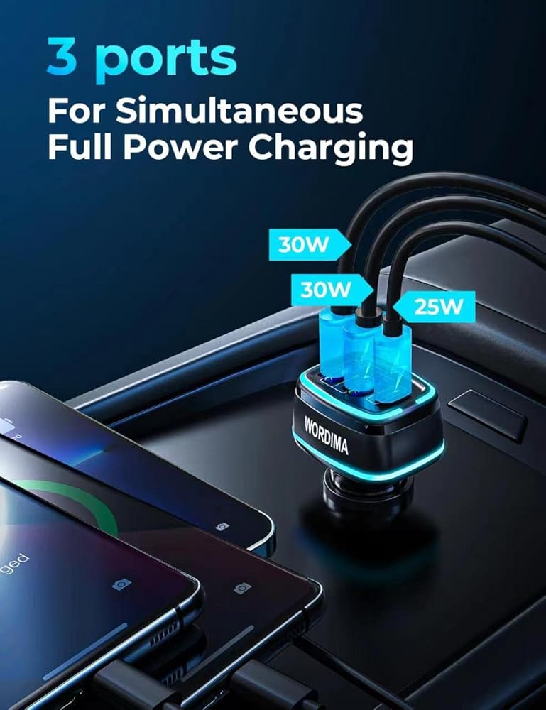 [Super Fast Charging Car Adapter] WORDIMA car charger adopts independent fast charging technology for each port, with a maximum output of 85W (30 + 30 + 25). Multi port USB / USBC car charger can enable three devices to charge 60% of your mobile phone in 30 minutes at the same time. (the PD on-board charger port can charge 80% within 30 minutes).