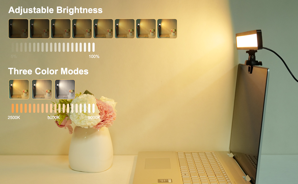 【ADJUSTABLE LIGHT FOR ZOOM MEETINGS】: Our zoom lighting have 3 color temperatures (white light/warm light/natural light) which are 2500k-9000k, 10 levels of brightness adjustment, and 33 LED lamp beads with 9W brightness. Easily change your ideal lighting with the switch. Webcam lighting for video conferencing provides a more professional appearance and streaming presence.