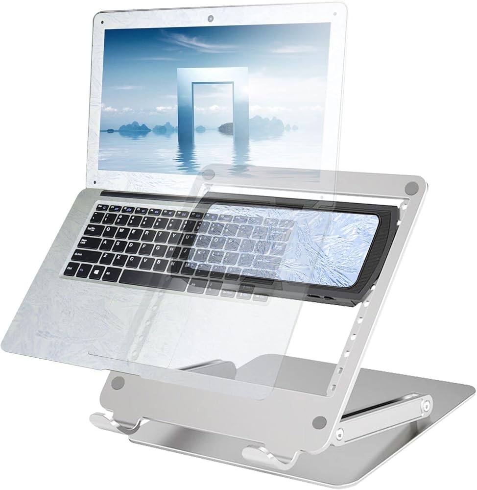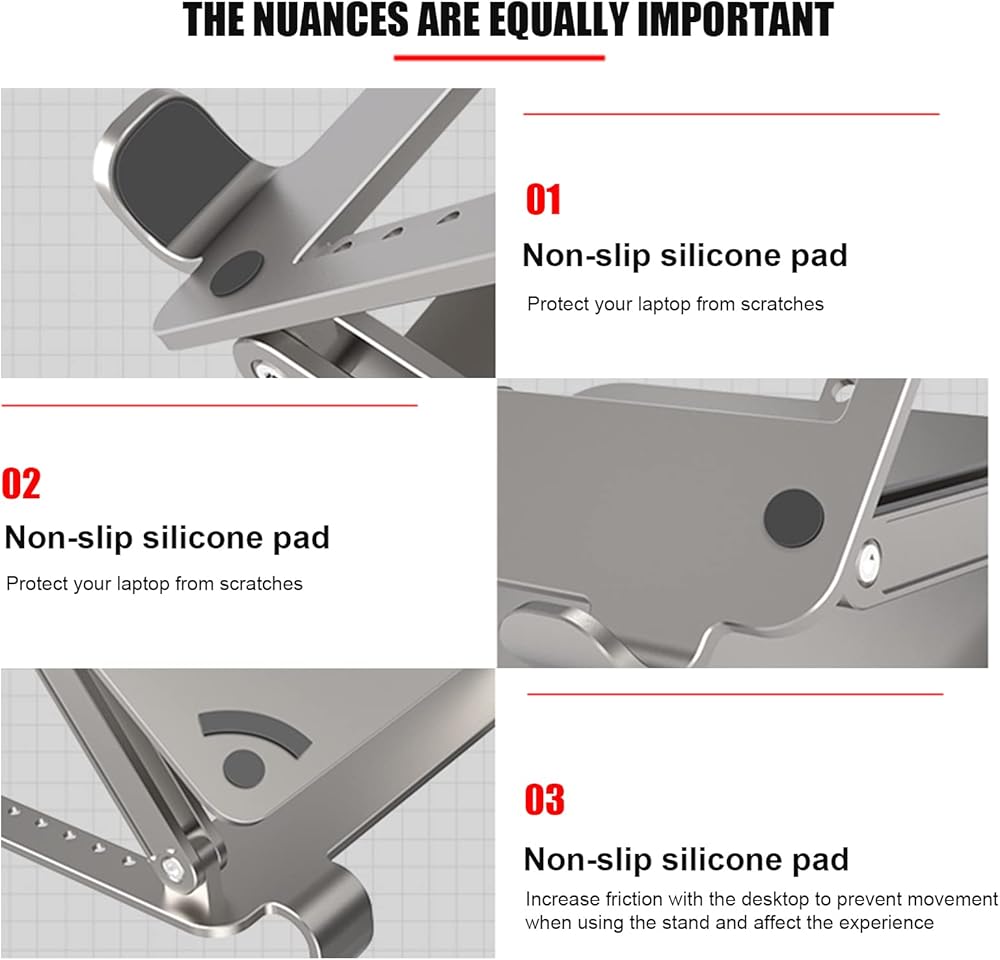 [Ergonomics]: The Z-type design is good for adjusting to an ideal height for typing, viewing and sitting. Promoting good posture for supporting your back and neck. This laptop holder will help reduce stiffness in your back and neck.With large support area and aluminum parallel bars are sturdy enough to support a large-sized laptop. 4 slide-proof silicone pads and the protective hooks prevent your computer from sliding.